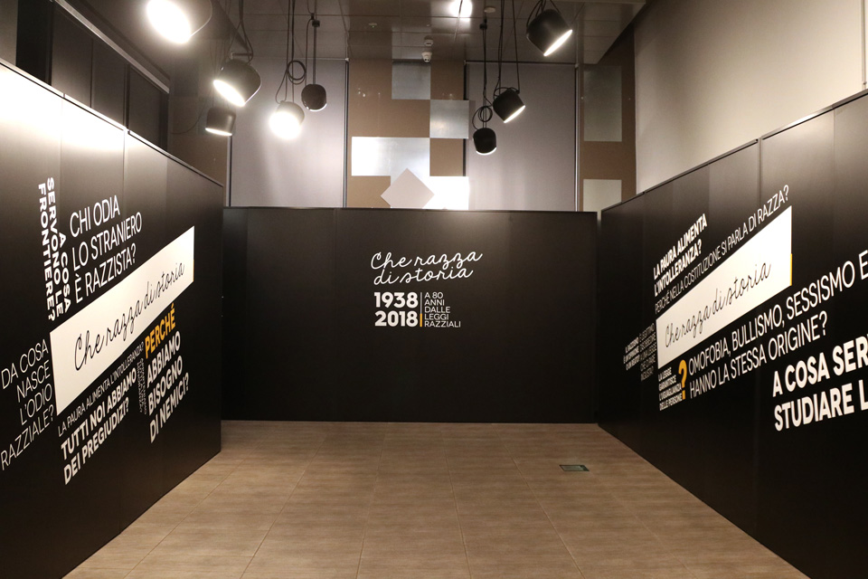 L’installazione Che razza di storia, attraverso una forma facilmente accessibile e interattiva, intende offrire un quadro di riferimento utile a collocare nel tempo e nello spazio la leggi razziste, richiamando la concreta realtà dei fatti accaduti e proponendo alcuni interrogativi. Documenti, immagini, filmati, testimonianze audio accompagnano il visitatore in un’esperienza emozionale condotta da luci, suoni e immagini. Le domande lungo il corridoio d’accesso pongono al visitatore alcune questioni universali e attualizzanti legate al razzismo e all’intolleranza.