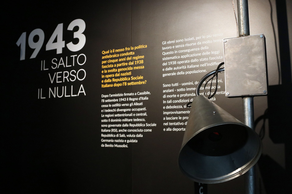 Il percorso di visita si articola su tre sezioni: Le leggi del 1938: una rottura nella storia d’Italia; 1943: Il salto verso il nulla; Dopo il 1945: il silenzio, la memoria, la storia.