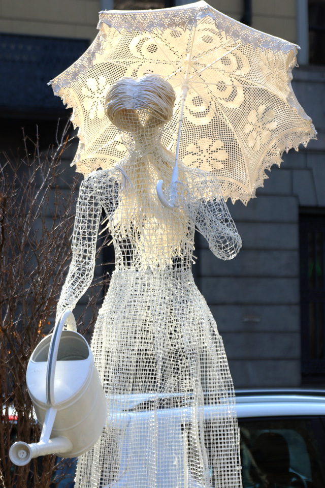 Si tratta di una raffinata damina d’altri tempi, tutta bianca, che con un innaffiatoio bagna le aiuole riparandosi dal sole con un ombrellino. E’ una nuova tappa di un percorso narrativo poetico e gentile, che Marasciuolo ha creato nel corso degli anni nel giardino, una storia d’amore che è partita con un uomo d’altri tempi che aspettava su una panchina la sua lei, passando per un giro insieme in bicicletta dei due innamorati, con un gatto nel cestino, fino ad arrivare ad una finestra, a cui i due si affacciano, avendo coronato il loro sogno d’amore.