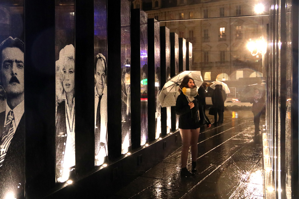 Formata da 20 pilastri ricoperti da una lamina inox specchiante ‘I volti del Cinema’ crea un legame tra la città , i film e lo spettatore che, camminando, si trova a percorre piazza Castello accompagnato dai protagonisti di alcune delle più importati pellicole cinematografiche girate a Torino. Camminando all’interno del colonnato un sistema di casse audio temporizzate nascoste all’interno dei pilastri e attivate dal passaggio degli utenti, riprodurrà , elemento dopo elemento, i brani più famosi estrapolati dalle colonne sonore dei film. L’installazione è totalmente accessibile: la mancanza di barriere architettoniche fa sì che tutti possano accedere all’intero percorso, e i dispositivi sonori permettono agli utenti non vedenti di interagire con la postazione.