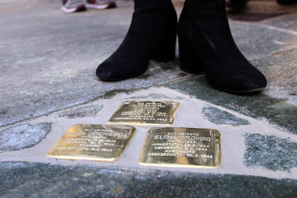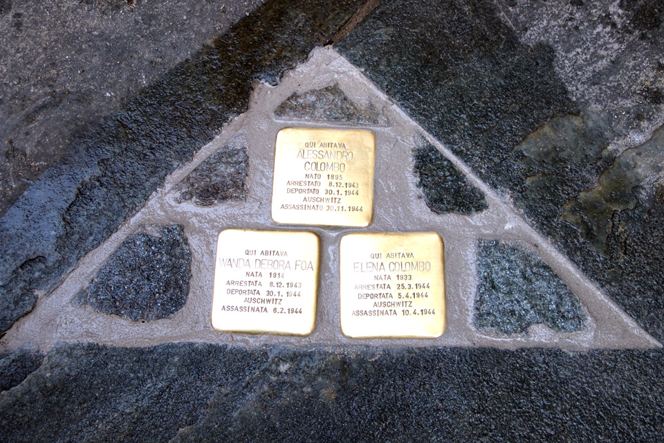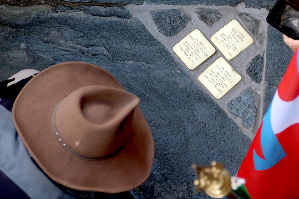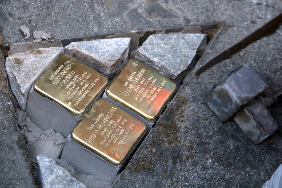 Nelle immagini la posa delle pietre in via Piazzi 3 dedicate a Alessandro Colombo, Wanda Debora FoĂ , Elena Colombo.