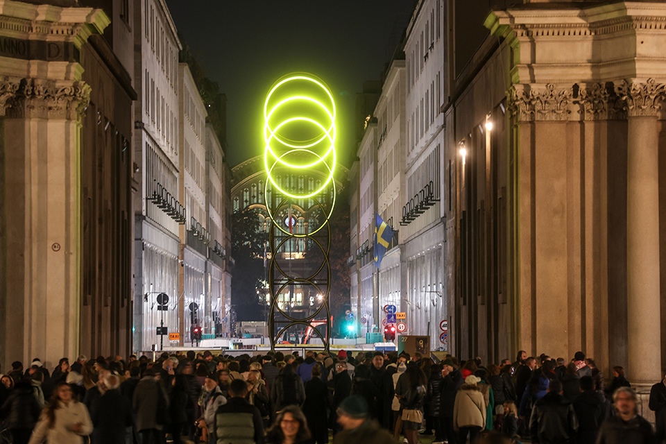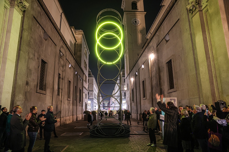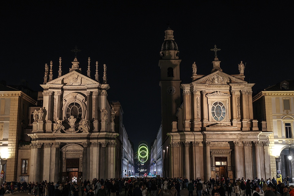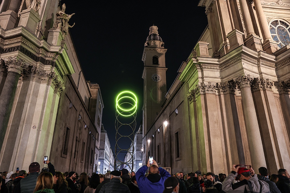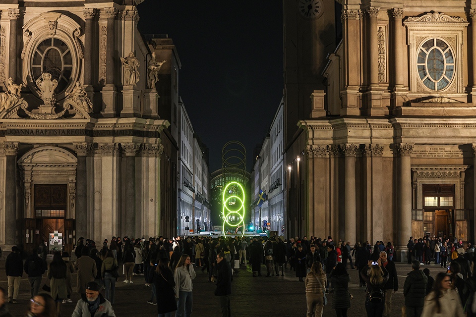Lâopera, realizzata con il sostegno delle Nitto ATP Finals, trae ispirazione dal gesto del palleggio che precede il servizio nel tennis. Il movimento della luce, che evolve da unâellisse a un cerchio, dialoga armoniosamente con le linee architettoniche delle chiese gemelle di piazza San Carlo, creando un effetto visivo che unisce arte contemporanea e patrimonio barocco.