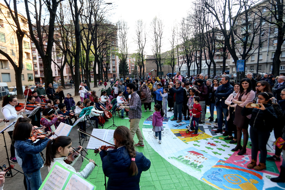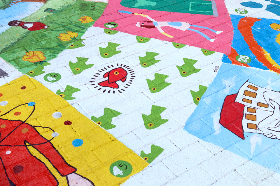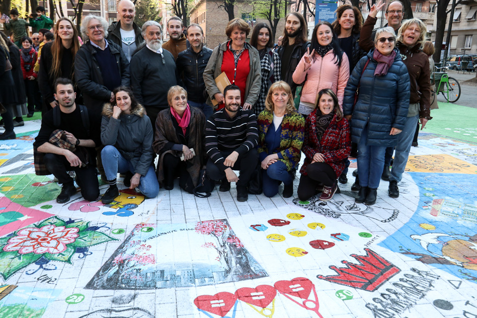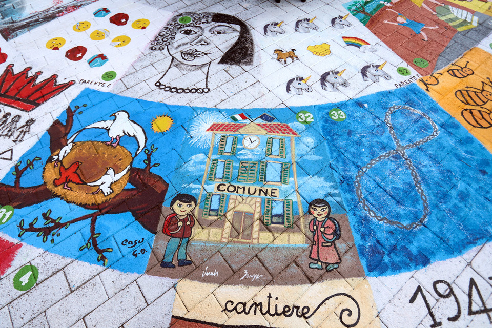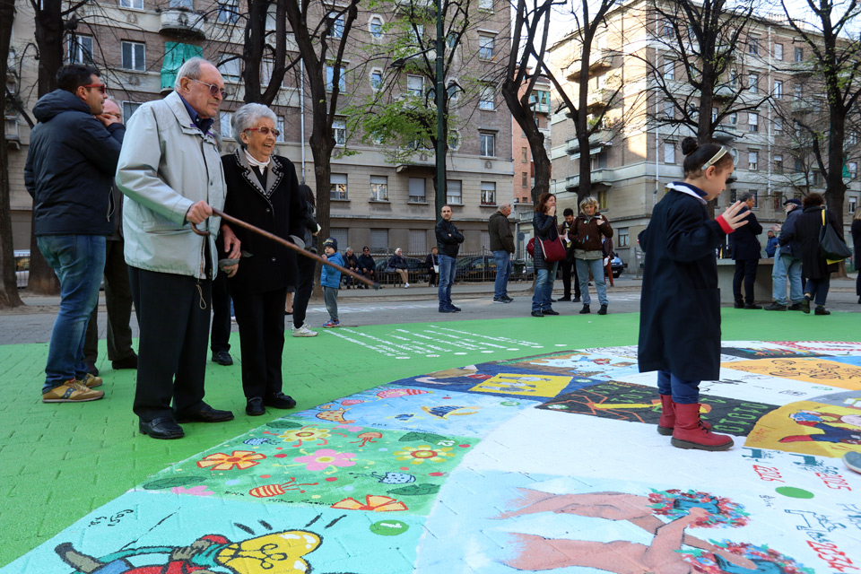 Un quartiere in trasformazione, una piazza animata e un nuovo gioco per imparare i principi della convivenza democratica. Esteso su un’area di 170 metri quadri, il gioco della democrazia è una rivisitazione artistica del gioco dell’oca, ideata da Gerardo Di Fonzo e realizzata in collaborazione con un team di artisti, per i bambini del Giardino Alimonda.
