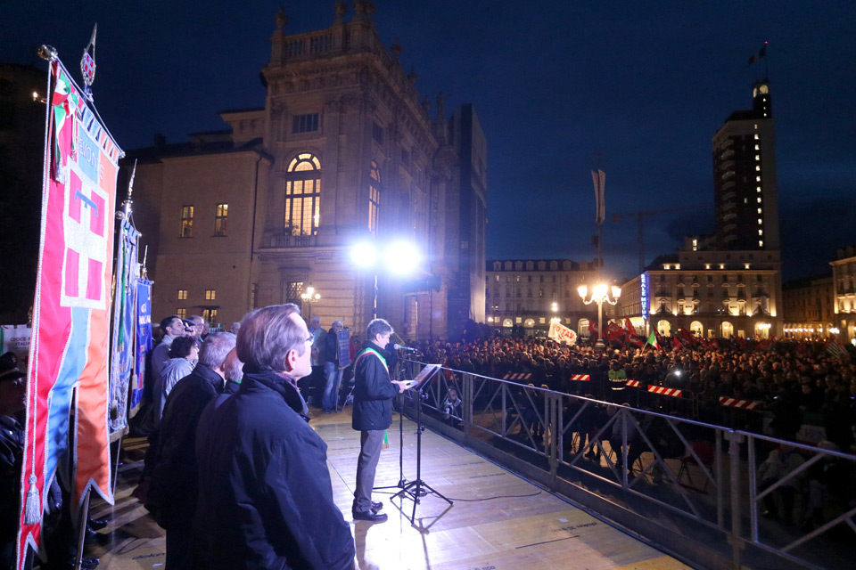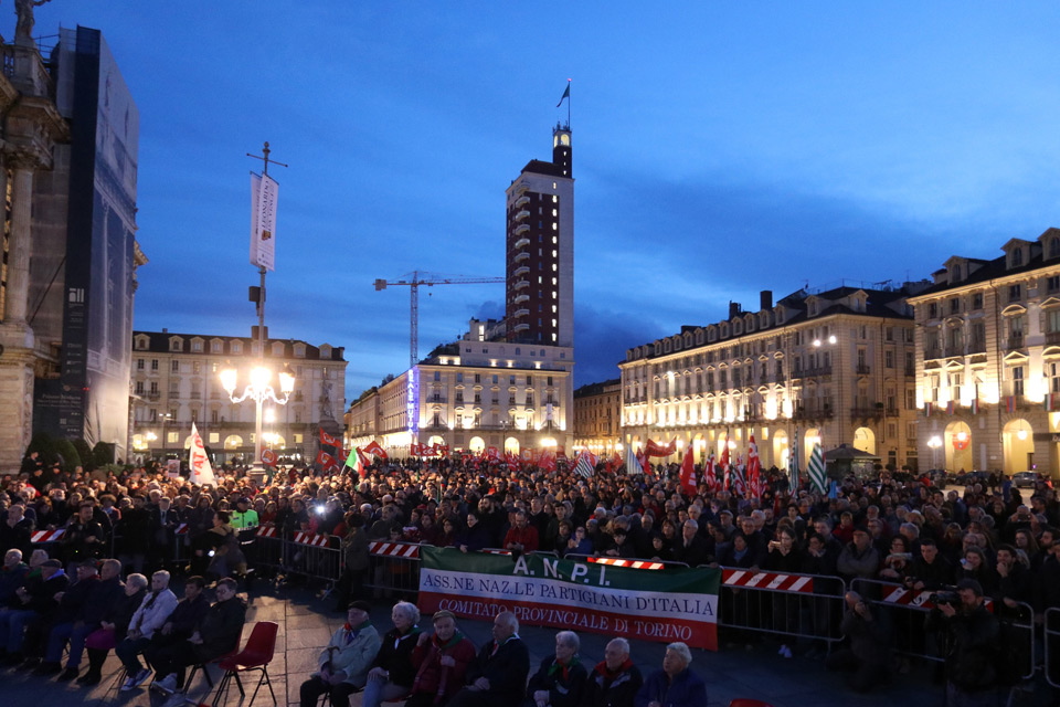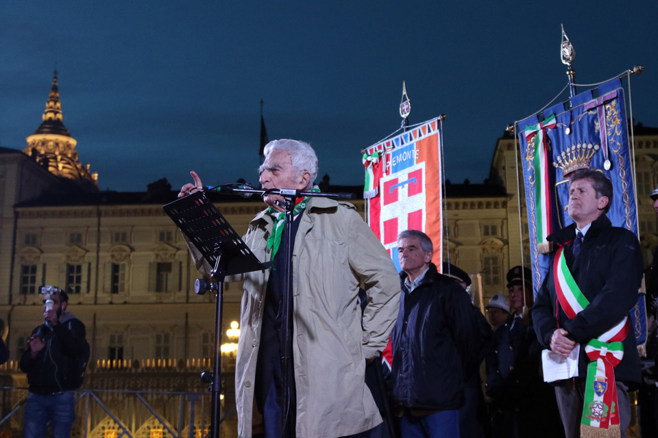 In piazza Castello hanno preso la parola, tra gli altri, Bruno Segre, Bruno Segre, presidente dell’Associazione nazionale perseguitati politici italiani antifascisti (A.N.P.PI.A.).