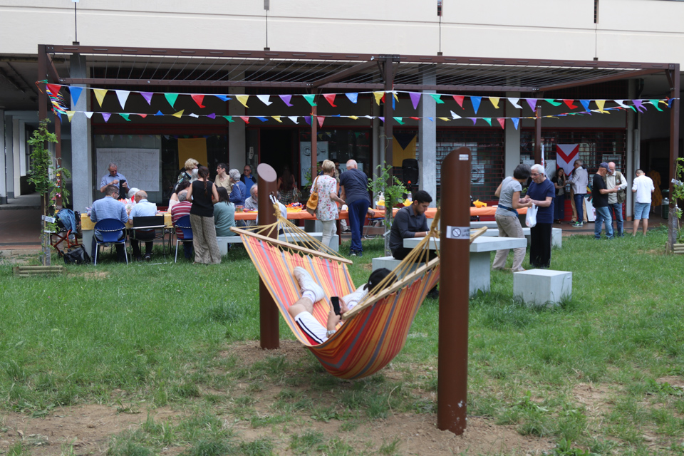 A tal fine sono stati posti dei tavoli quadrati con sedute, un lungo tavolo per pranzi e merende di gruppo, una struttura a pergola davanti all’area studio, otto pali in legno corredati da supporti per amache, sedute informali sagomate nel prato, due tavoli da ping-pong, tante nuove panchine a tre assi posizionate in modo da creare dei “salottini” per chiacchierare e incontrarsi all’aperto.