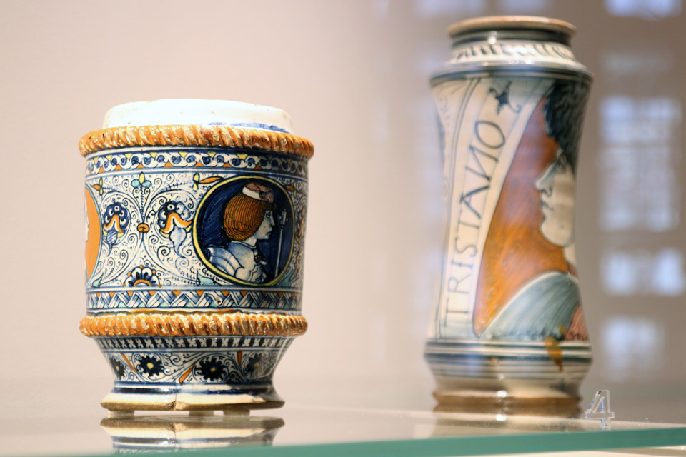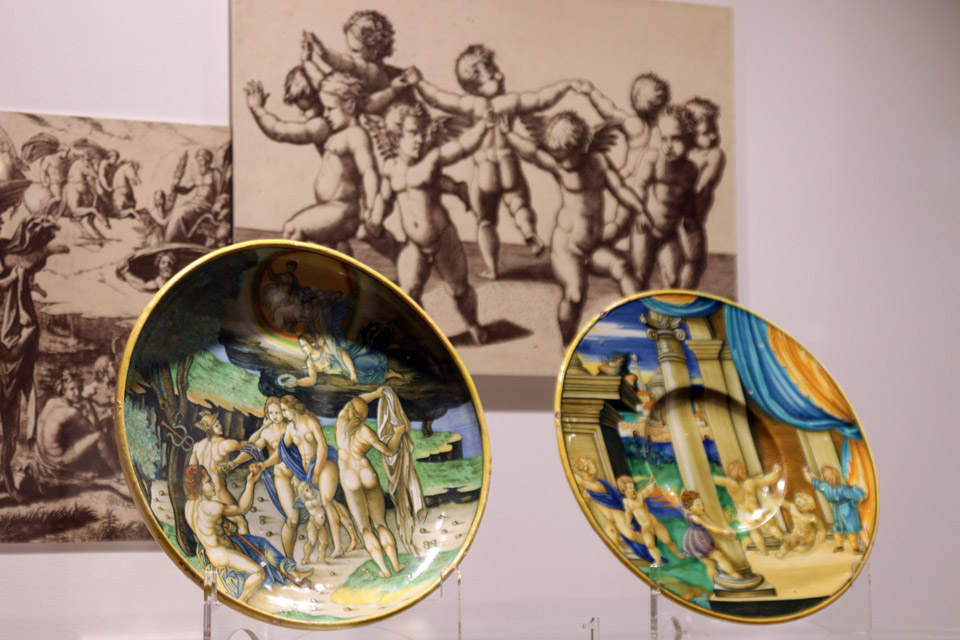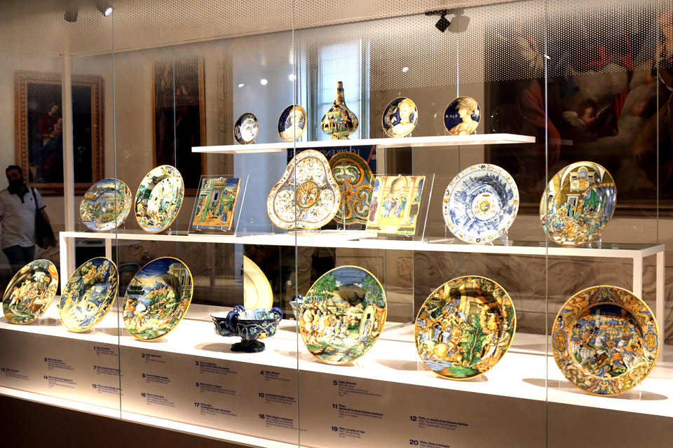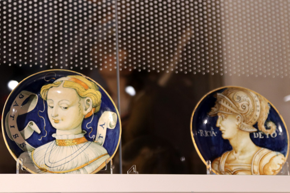 In mostra alcune opere dei principali pittori su maiolica conosciuti come Nicola da Urbino e Francesco Xanto Avelli e alcuni capolavori come una coppia di albarelli di Domenigo da Venezia, un grande rinfrescatoio di Urbino e la brocca in porcellana medicea di Palazzo Madama, eccezionale esemplare della prima imitazione europea della porcellana cinese, realizzato da maiolicari di Urbino che lavoravano a Firenze alla corte di Francesco I de’ Medici.