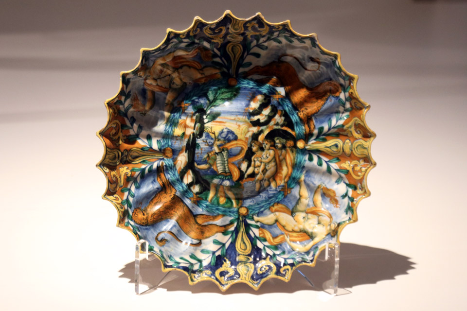 L’esposizione prosegue illustrando l’ampia varietà di temi riprodotti sulla maiolica istoriata, che, oltre ai soggetti religiosi, vede riccamente rappresentati soggetti profani quali miti antichi, romanzi cavallereschi, storie sacre e profane che arricchivano gli ambienti privati e pubblici delle dimore signorili.