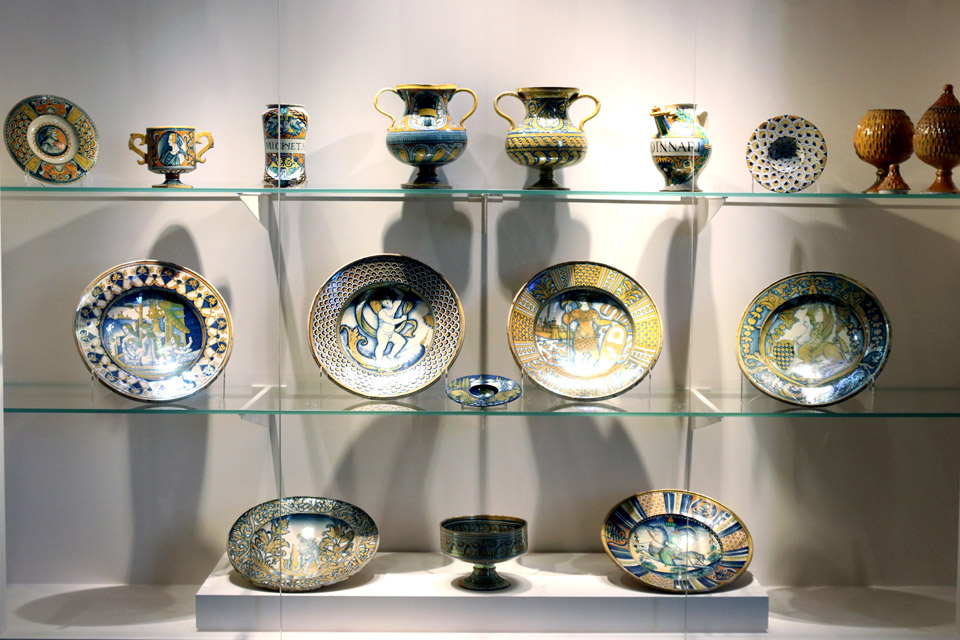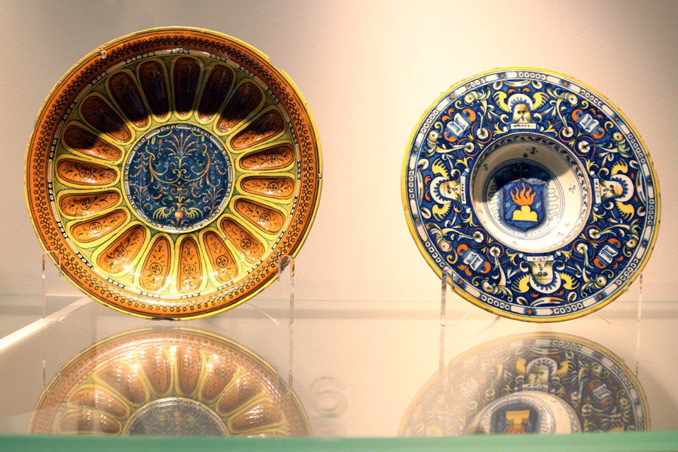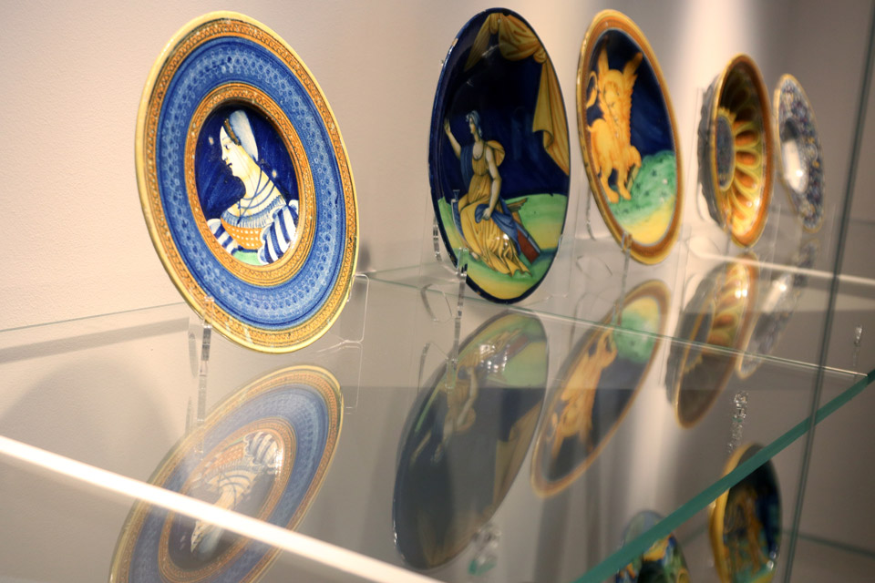 Si entra poi nella Sala del Senato dove il percorso si snoda attraverso i principali centri produttori di maiolica in Italia, come Deruta, Faenza, Urbino, Gubbio, Venezia, Castelli e Torino.