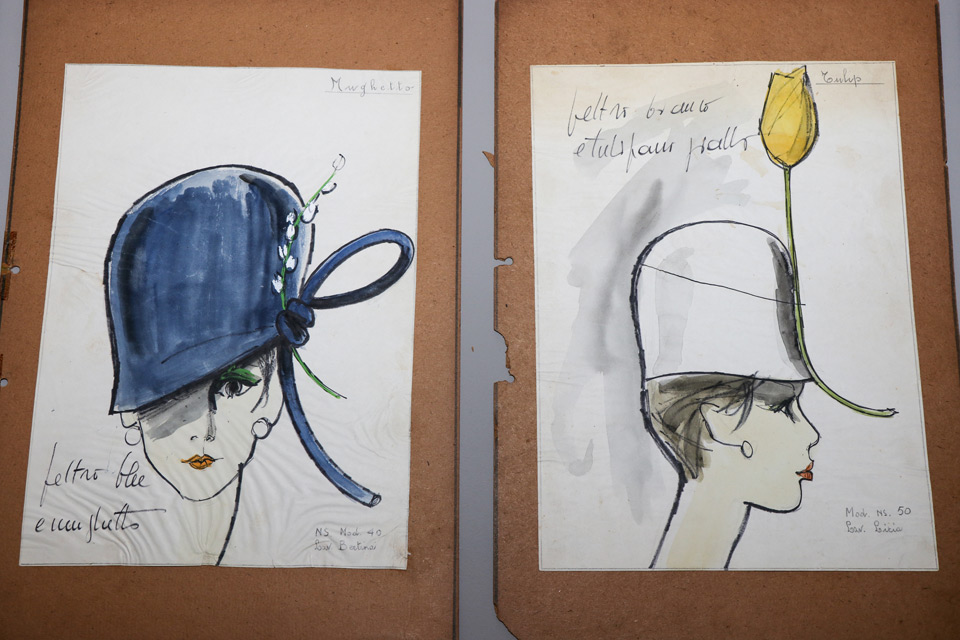 A impreziosire l’allestimento un importante nucleo – mai esposto prima – degli schizzi originali di modelli e cappelli della collezione di Pina Cerrato, celebre e storica modista.