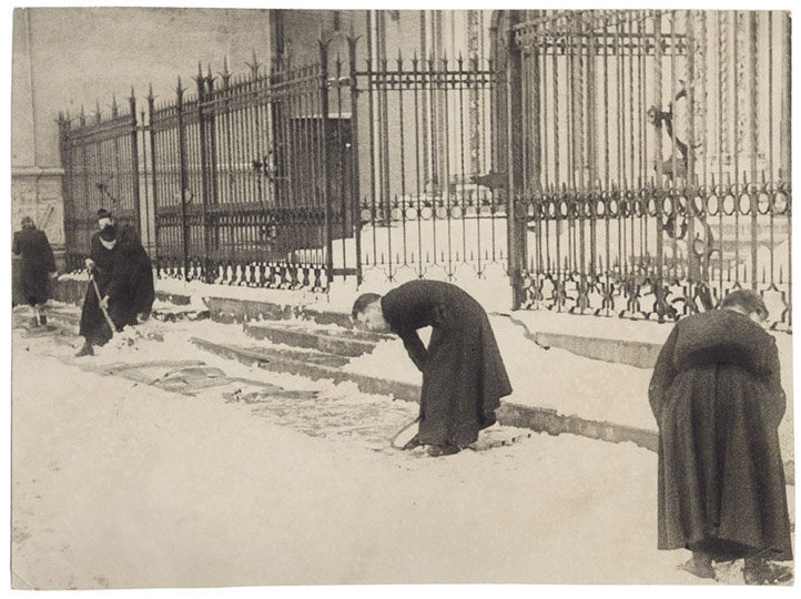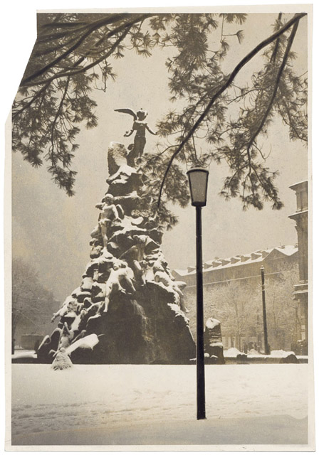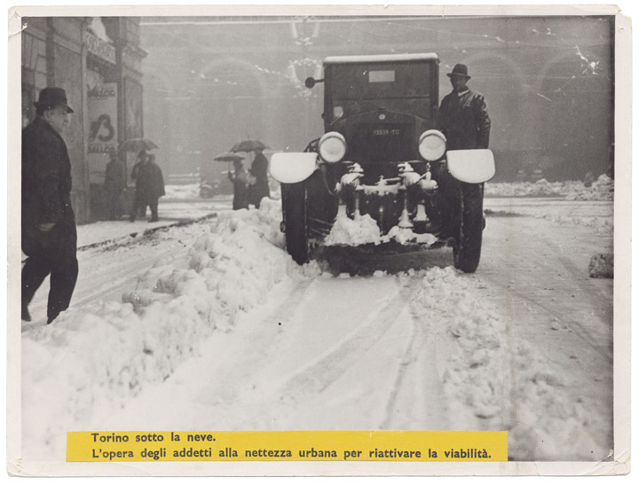 Uno spazio particolare è inoltre dedicato alle immagini di Torino sotto i fiocchi bianchi dopo le incursioni dal cielo di novembre e dicembre 1942 dell’Ufficio Protezione Antiaerea. “A questo nucleo – spiegano i curatori – si aggiunge una sezione documentaria poiché la neve è sì sorpresa, gioia per gli occhi, poesia pura che trasfigura ogni cosa, ma la città , a differenza del villaggio che vive al ritmo delle stagioni, non si adegua semplicemente alla sua presenza, ma deve limitarne l’impatto affinché la vita prosegua sempre uguale, scandita dagli stessi ritmi indipendentemente dal clima e dagli agenti atmosferici. E così, a partire dal 1700, si susseguono i provvedimenti per lo sgombero della neve”.