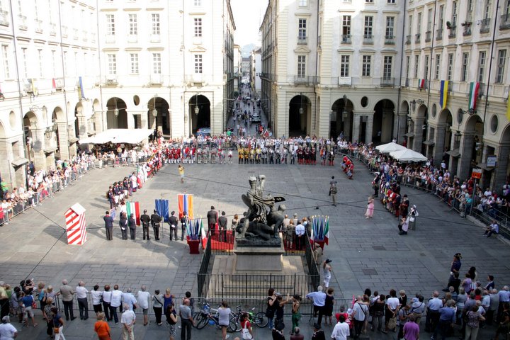 La tradizionale sfilata del Gruppo storico Pietro Micca sul percorso corso Siccardi, via Garibaldi, via Milano, piazza Palazzo di Città .
