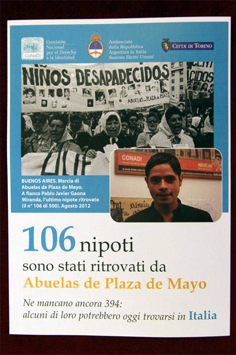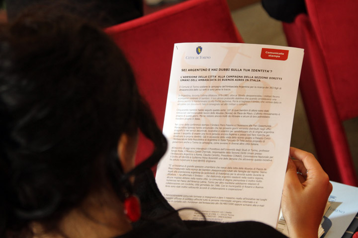 Nel corso della conferenza stampa il Sindaco Piero Fassino e l’Assessore alle Pari Opportunità Mariacristina Spinosa hanno annunciato che nei prossimi giorni verranno distribuiti negli uffici anagrafici e nei servizi decentrati, locandine e volantini per sensibilizzare chi di origine argentina avesse il sospetto di essere una tra le persone ancora disperse e possa così fare ricerche per ricostruire la propria identità. Già in occasione della visita dello scorso giugno a Palazzo Civico l’Ambasciatore della Repubblica di Argentina in Italia Torcuato Di Tella aveva proposto di presentare anche a Torino la campagna, come avviene in diverse altre città italiane.