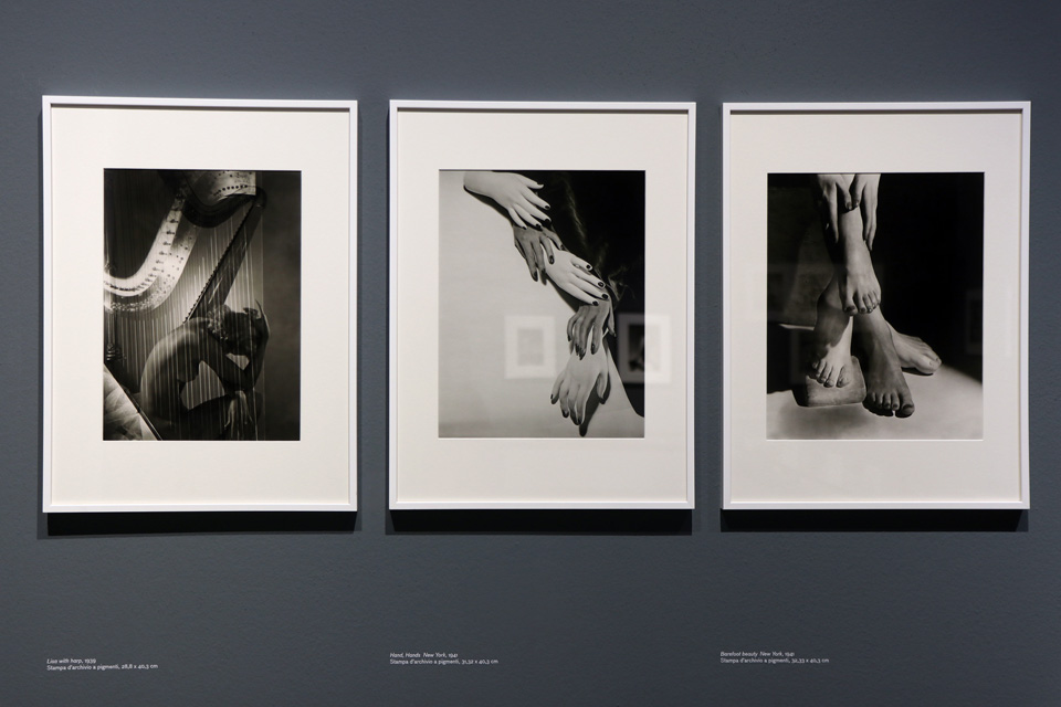 La prima sezione funge da introduzione all’autore e ai suoi interessi di ricerca: il rapporto natura-cultura, il ritratto ambientato e la grande cura del dettaglio, elementi riscontrabili sia nelle fotografie nelle quali immortala il milieu intellettuale della Parigi degli anni Trenta che negli autoritratti e nelle nature morte. Nella seconda sezione, trovano spazio le opere realizzate durante la fase parigina e quella newyorchese, periodi molto prolifici, influenzati dal romanticismo e dal surrealismo, durante i quali realizza immagini iconiche quali Mainbocher Corset, Paris, 1939, e Hand, Hands, New York, 1941. L’uso del colore nella fotografia di moda è il soggetto che apre la sezione nella quale vengono ospitate le più celebri copertine di “Vogue”. A fare da trait d’union troviamo le sorprendenti immagini d’interni realizzate a partire dagli anni Quaranta e divenute presto una delle occupazioni principali del fotografo, anche grazie all’interesse di Diana Vreeland (direttrice di “Vogue” dal 1962), che commissiona ad Horst una serie di servizi su case e giardini degli artisti e delle celebrità. Tra tanti realizzati dall’autore, un focus viene dedicato all’Italia, con l’appartamento romano dell’artista Cy Twombly, adornato di proprie opere e sculture classiche, e con il fascino senza tempo della tenuta di Villar Perosa, all’interno della quale posa un’elegantissima Marella Agnelli.