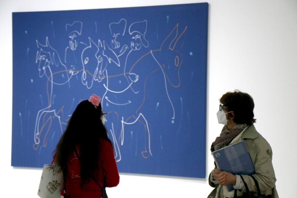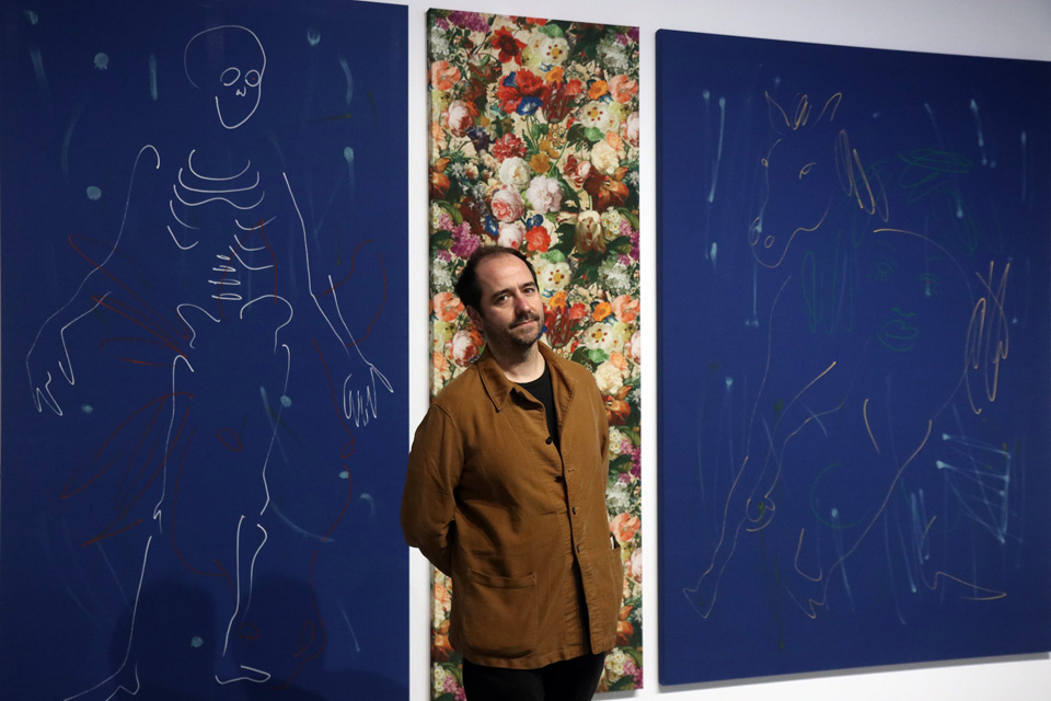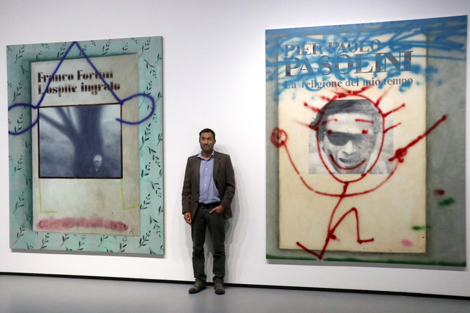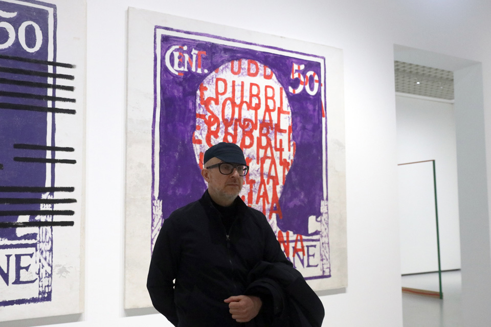 Così come quel medesimo pensiero ha trovato nuove conferme, nuovo terreno di riflessione, nelle trasparenze di Riccardo Baruzzi (Lugo, 1976), nelle sue tele fatte di figure abitate da altre figure, di contorni che si sovrappongono in uno spazio contraddittorio, di sfondi profondi e senza tempo da cui emergono immagini sempre sul punto di dissolversi nuovamente. Il suo immaginario si nutre della conoscenza dell’arte passata così come di forme di decorazione popolare e l’apparente contrasto si scioglie nella leggerezza di una pratica che si muove libera tra la linea pittorica, il disegno digitale, il riverbero sonoro e l’azione performativa.” Elena Volpato