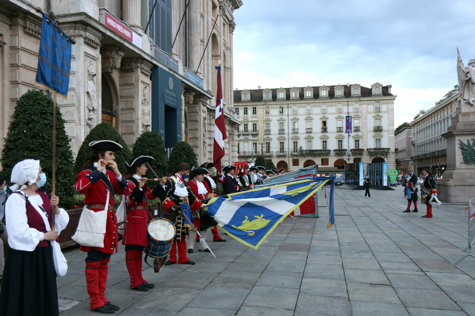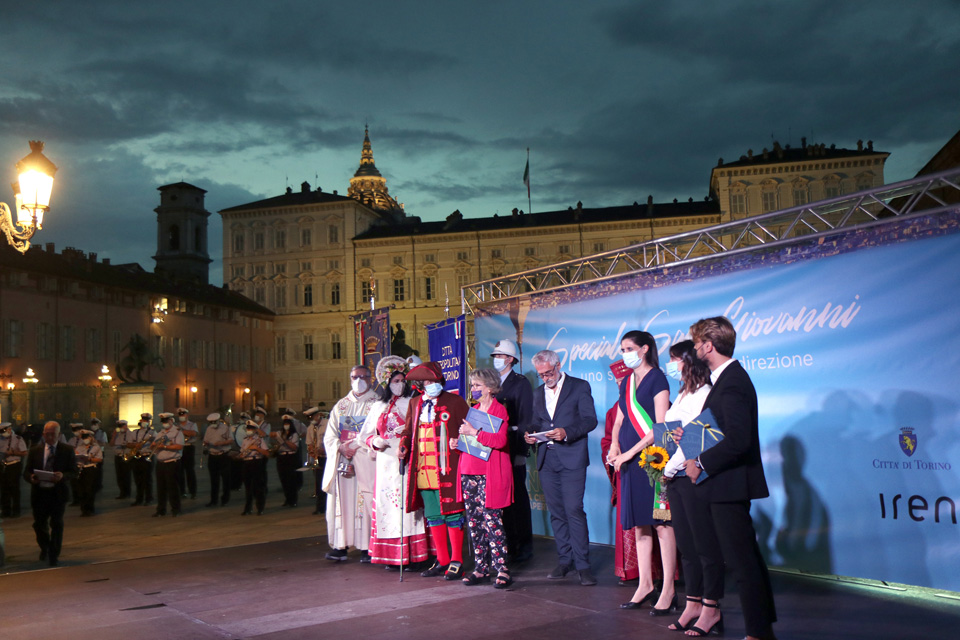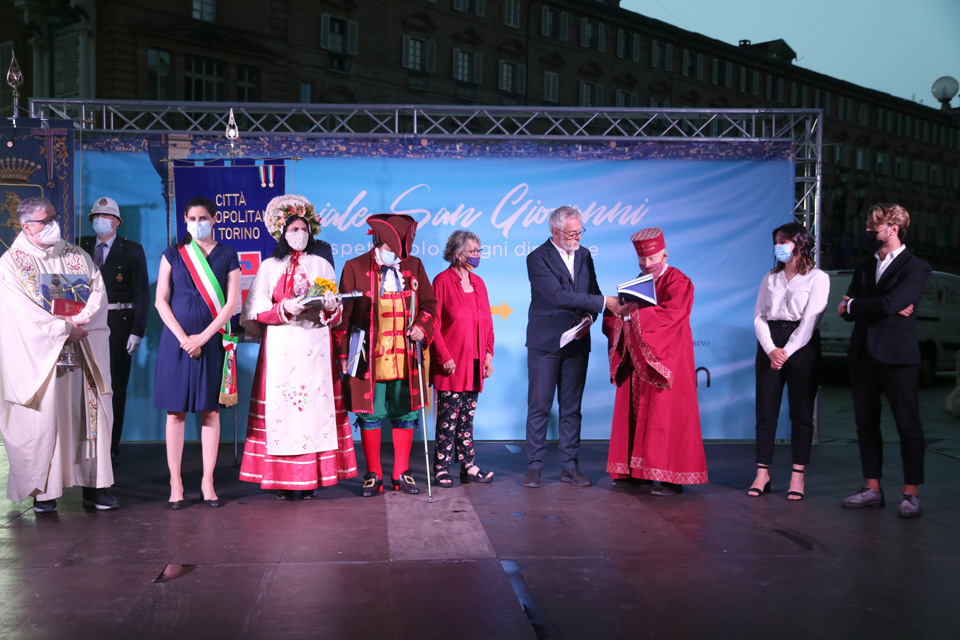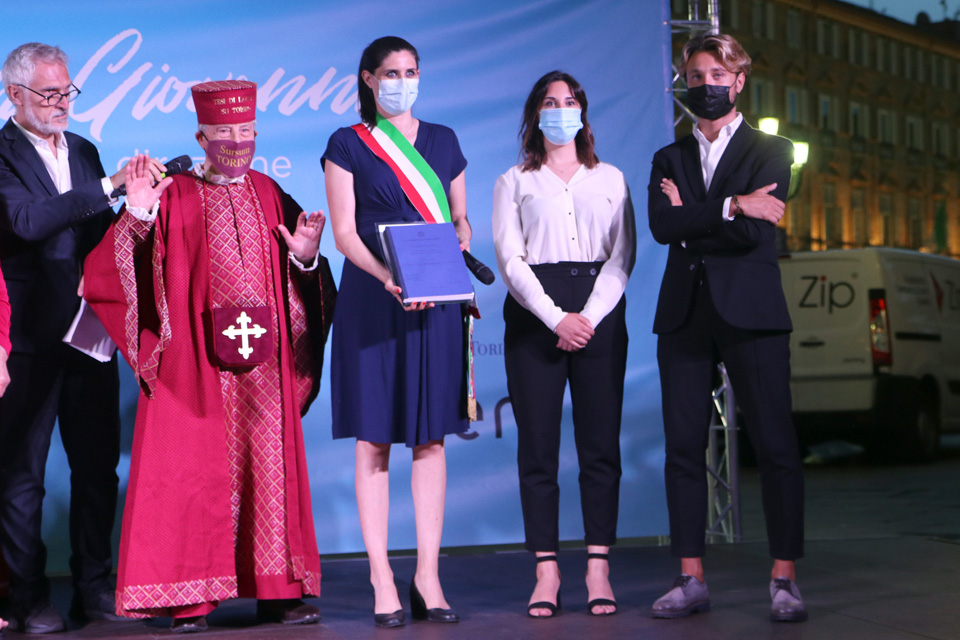 Prima dell’accensione della catasta in piazza Castello, la Sindaca Chiara Appendino ha ricevuto i Pani della Carità da Gianduja e Giacometta e sono stati consegnati i premi delle Tesi di Laurea su Torino.