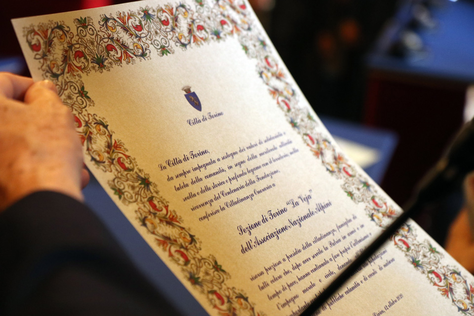 Si è svolta questa mattina, nella Sala Rossa di Palazzo Civico, la cerimonia di conferimento della cittadinanza onoraria alla sezione di Torino dell’Associazione Nazionale Alpini, fondata nel1920 e conosciuta anche come “la Veja”, essendo stata la prima struttura territoriale dell’ANA.