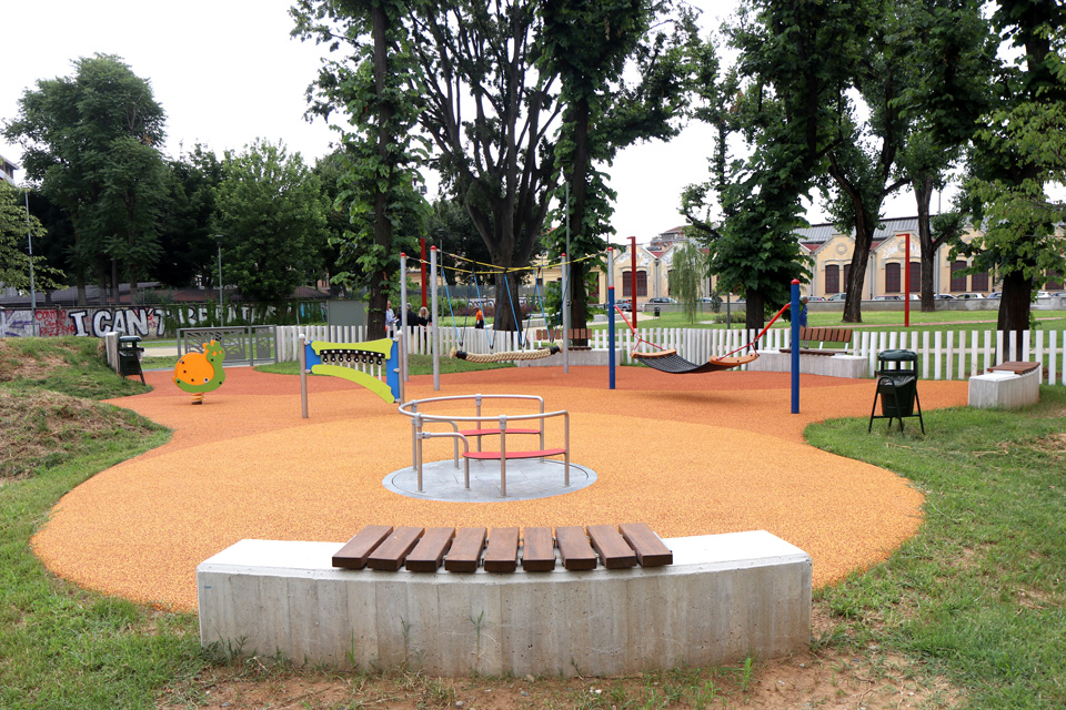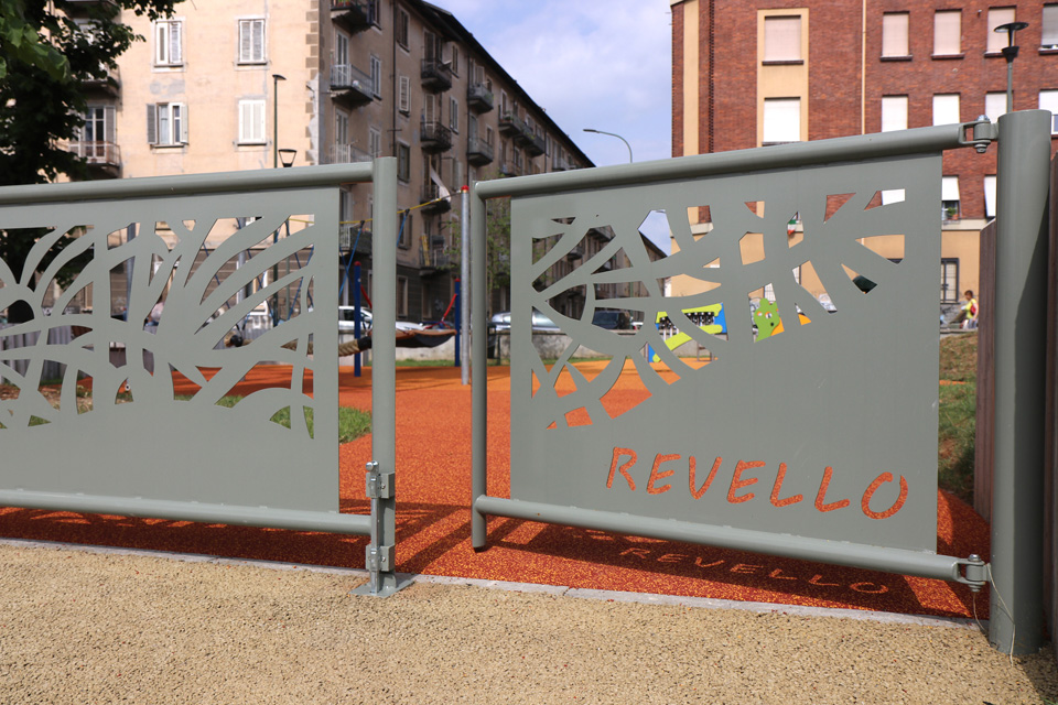 Lungo l’asse di via Revello è stata realizzata una nuova area giochi con attrezzature ludiche innovative e inclusive, delimitata da una staccionata in legno di castagno e da una collinetta a prato. Le attrezzature comprendono anche giochi che spingono il bambino a misurare le proprie abilità psico-motorie e percettive e quindi a progredire nel rapporto tra il proprio fisico e lo spazio che lo circonda: dondolarsi e muoversi (scivolo, amaca, gioco a molla e giostrina), conoscere lo spazio (salterelli), sentire (xilofono), gestione della forza e dell’equilibrio (salterelli, pali con arrampicata trave d’equilibrio, ponte tibetano), senso del tatto (materiali diversi che costituiscono i giochi: legno, plastica, metallo, corda, ecc.).