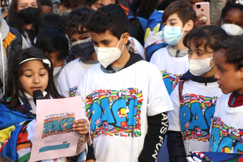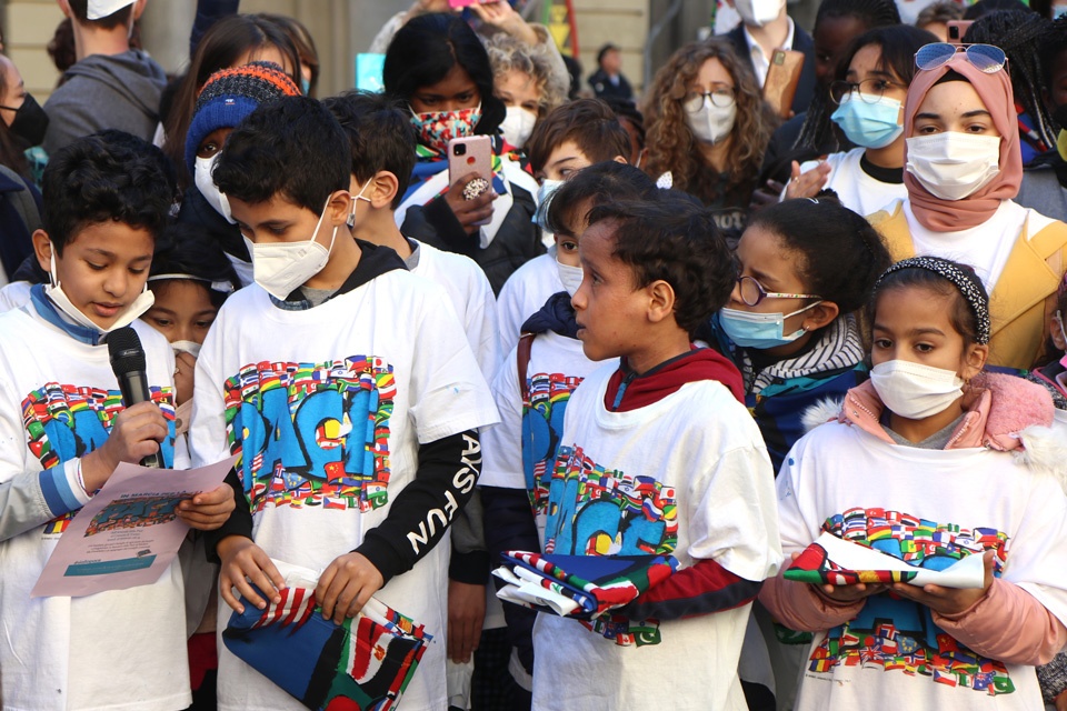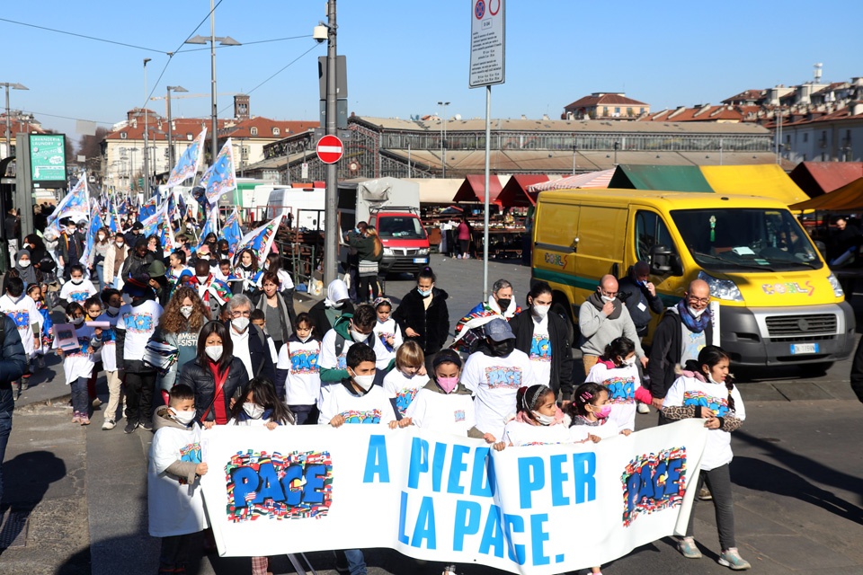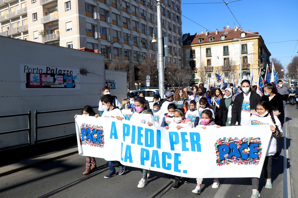 “A piedi per la pace“. Circa 300 persone fra bambini, giovani e famiglie di ogni parte del mondo, sono partiti dal Sermig, dando vita a un colorato corteo, per consegnare la bandiera della pace alla Città.