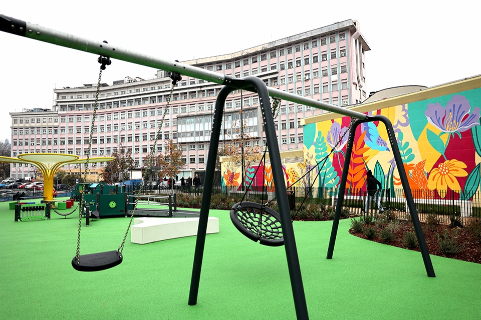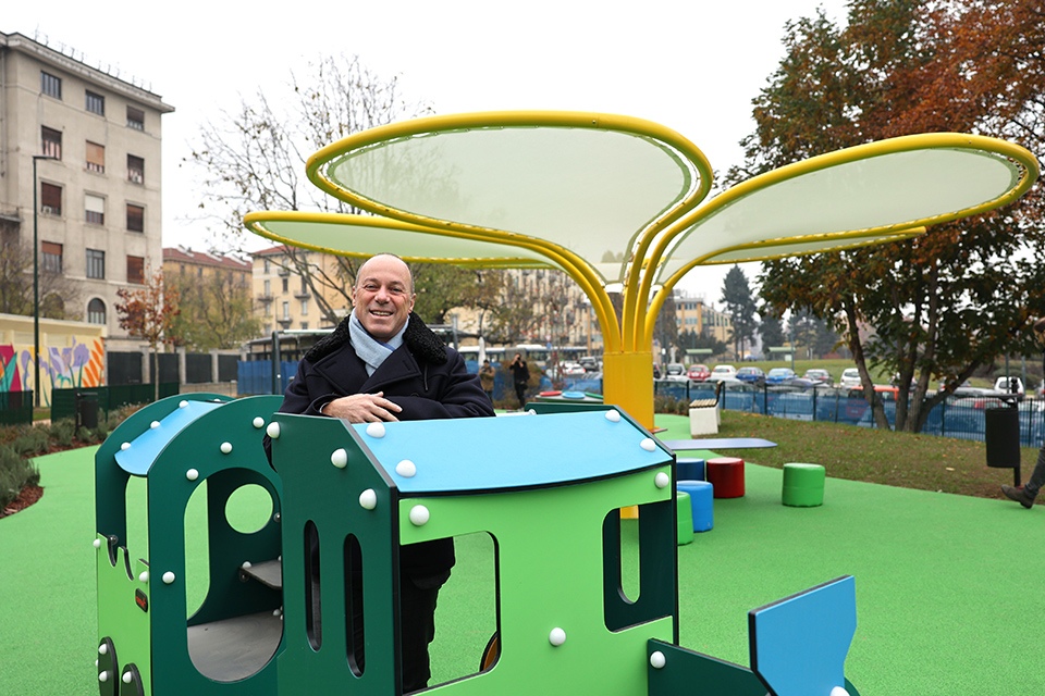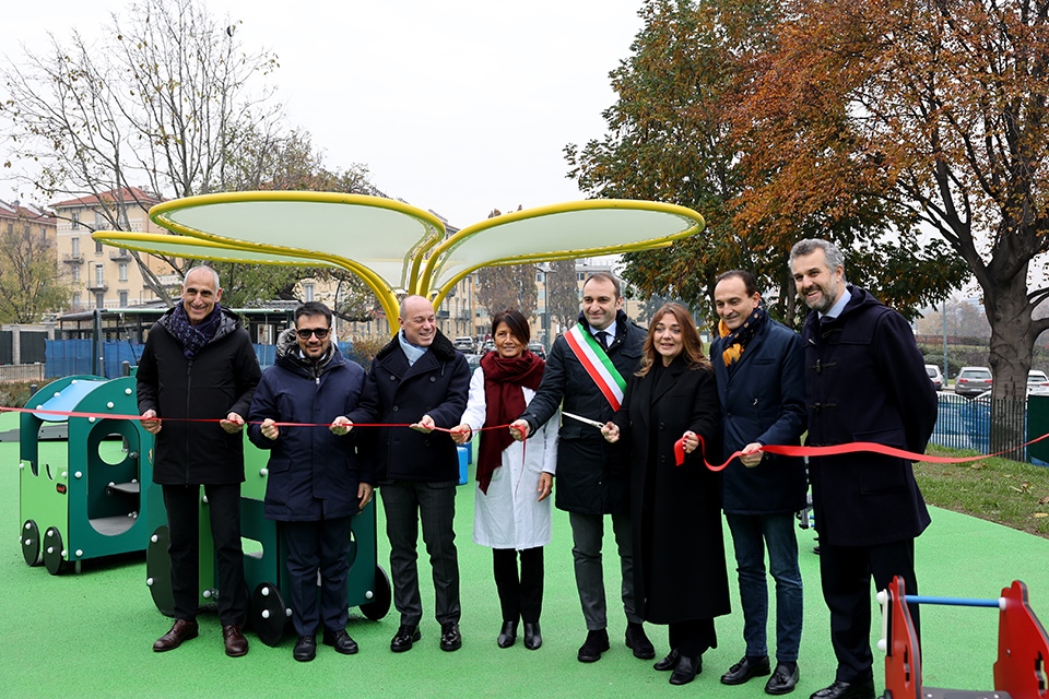 L’intervento di riqualificazione, firmato dallo studio Miroglio + Lupica Architetti Associati, si è sviluppato su un’area ampliata di circa 1600 mq e ha incluso la bonifica e la fruizione del verde circostante, riportando così a nuova vita un’area fino a ieri inutilizzata. Oggi la troviamo attrezzata con giochi inclusivi per i più piccoli, con sedute e un gazebo per godersi momenti di relax, arricchita con nuovi alberi, siepi e arbusti da fiore intervallati da prato erboso e pavimentazioni realizzate con materiali all’avanguardia sia per la sicurezza degli utenti sia per il minor impatto ambientale; un’attenzione e una sensibilità verso l’ambiente sottolineata anche dalla scelta degli architetti di installare solo giochi made green (realizzati con materiali riciclati post consumatore come rifiuti oceanici, tessuti usati, rifiuti di imballaggi alimentari..) e born green (realizzati con materiali naturali come legno proveniente da una selvicoltura sostenibile).