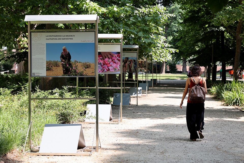 Dalla scorsa primavera, nel Boschetto dei Giardini Reali, l’aiuola del Bastion Verde accoglie centinaia di esemplari di Rosa damascena provenienti dalla Siria, un giardino che accompagna il pubblico verso la mostra fotografica e l’installazione artistica Floral Tapestry of Craftsmanship.