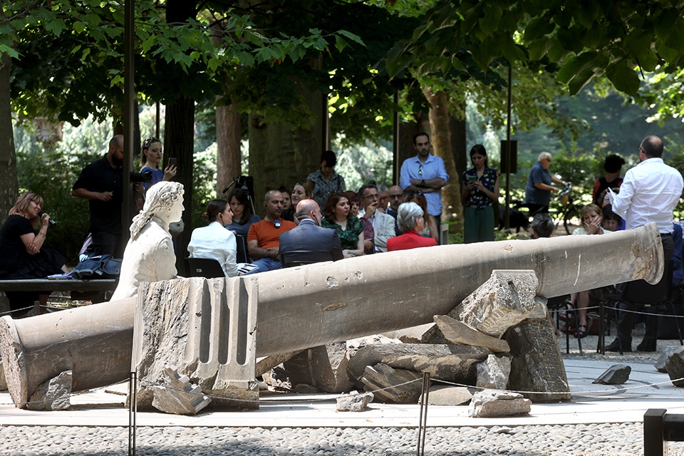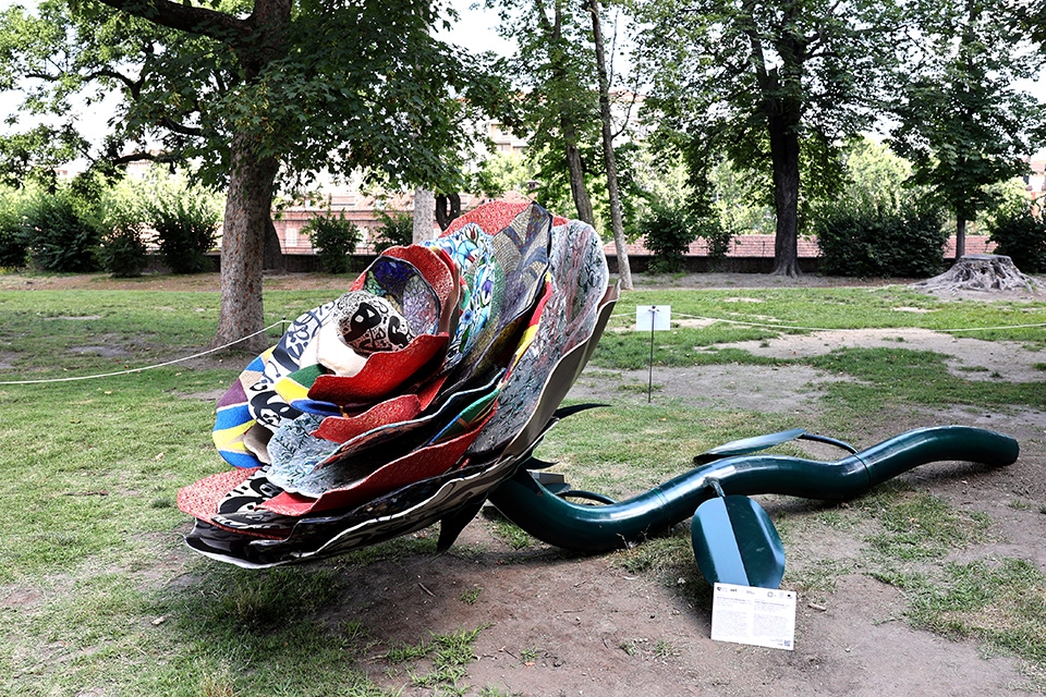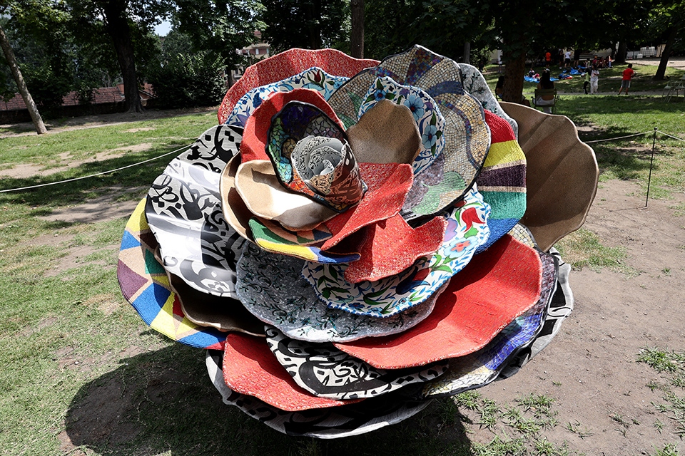 L’opera rende omaggio alle attività artigianali che hanno prosperato in Siria per secoli e celebra la maestria e la bellezza delle pratiche artistiche. L’installazione, esposta di fronte al Bastion Verde, rappresenta una grande Rosa di Damasco, realizzata con attenzione meticolosa ai dettagli. Ogni petalo è composto da vari materiali come il vetro, la ceramica, la madreperla e con lavorazioni tradizionali come il rame inciso, la paglia intrecciata e il tessuto broccato. Nella cultura siriana, la Rosa damascena rappresenta la bellezza e l’interconnessione di forme d’arte diverse: ingigantendone le dimensioni e diventando scultura, l’installazione invita il pubblico ad apprezzare i dettagli intricati e le caratteristiche uniche di ogni petalo, che rappresentano l’individualità e la creatività siriane. Per enfatizzare ulteriormente l’attenzione sulla bellezza dei particolari, gli autori dell’opera hanno scelto di rimanere anonimi, celebrando così le abilità collettive.