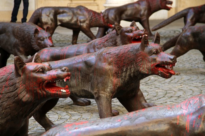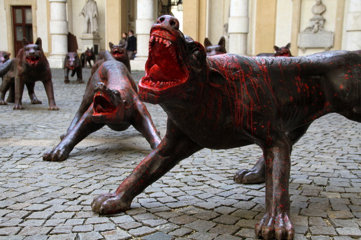 L’opera, di grande effetto scenografico e dai forti contenuti sociali, è composta da un branco di lupi dalle fauci insanguinate che si avventano contro una catasta di libri, sormontati dal volume di Kant La critica della ragion pura.