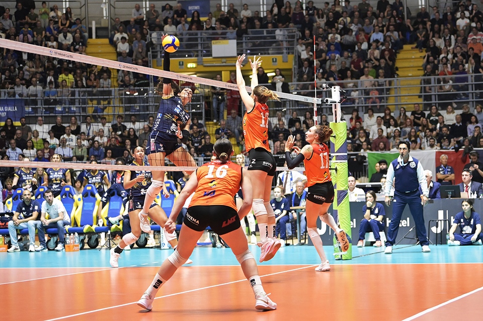 Praticamente senza storia la prima frazione con Grobelna e compagne incontenibili per le avversarie, già superate a domicilio per 3 a 0. Determinate a regalare la Coppa a società e tifosi, partono subito forte e chiudono il set con un distacco abissale: 25 a 9. Le biancoblù di coach Giulio Bregoli sembrano di un’altra categoria. Leggermente più combattuta, ma mai in discussione, la seconda frazione finisce 25 a 20. A Chieri sono sufficienti poco più di 40 minuti per salire sul tetto d’Europa.