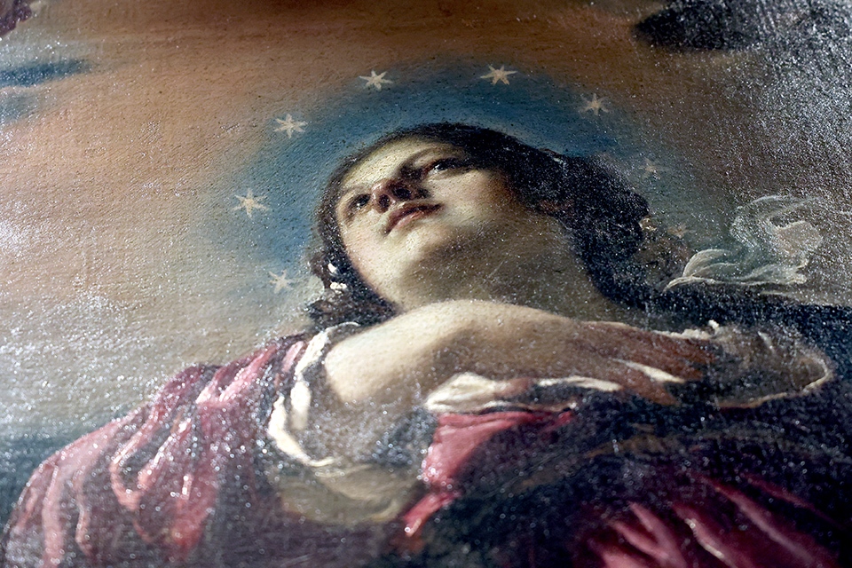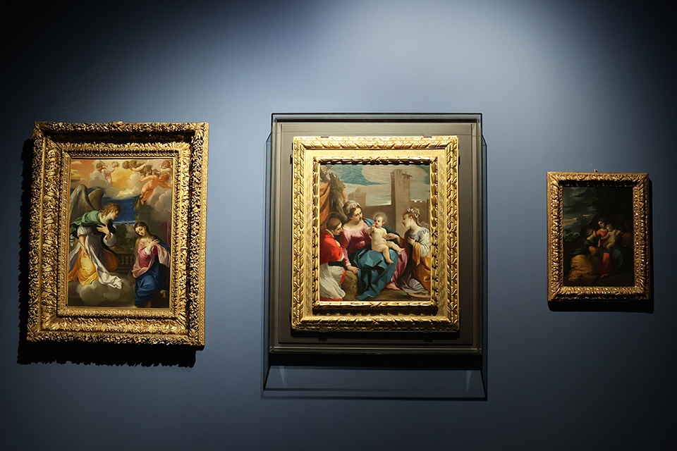 Guercino ci appare, circa quarantenne, e con gli strumenti del mestiere, nel raro Autoritratto della Schoeppler Collection di Londra che ben introduce al percorso: un’opera intima e privata che proprio per questo non risulta nel suo famoso “Libro dei conti”, ma che testimonia il carattere di un uomo fiero e semplice ad un tempo. La fase della formazione è debitrice, come per tutti i pittori, dello studio di opere di grandi maestri e dell’incontro con personalità che incidono nella maturazione di un artista: per Guercino punti di riferimento furono in particolare Ludovico Carracci, ammirato a Bologna ma anche a Cento – di cui si espone in mostra il prezioso olio su rame con l’Annunciazione dai Musei di Strada Nuova di Genova – e sul versante ferrarese (prima del viaggio a Venezia) lo Scarsellino e Carlo Bononi. Entrambi gli autori sono presenti nel percorso, accanto a due importanti lavori giovanili di Guercino: la piccola tavola con Il matrimonio mistico di santa Caterina in prestito dalla Collezione d’arte Credem e la suggestiva pala della chiesa parrocchiale di Renazzo con Un miracolo di san Carlo Borromeo.