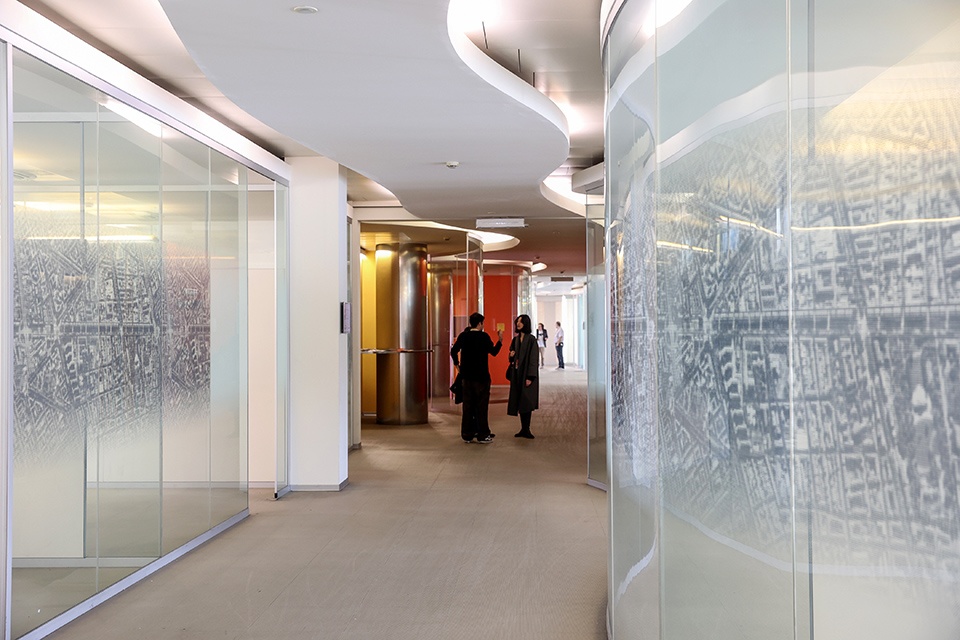 Spazi caratterizzati da linee curve e sinuose, pareti trasparenti e pochissime porte, molti colori e giochi di luce. Un ambiente fluente, giocoso e colorato, caratterizzato dall’assenza di angoli retti e zone buie. Una nuova dimensione creativa dove l’arte si sostituisce ai complementi d’arredo convenzionali d’ufficio, generando un linguaggio espositivo inesplorato ed inaspettato. Gli spazi che un tempo erano