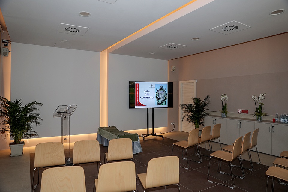 Il nuovo spazio è stato realizzato grazie alla ristrutturazione dell’edificio in passato adibito a camera mortuaria dove è stata allestita una sala di circa 90 mq con una trentina di posti a sedere, arredi e un leggio. La sala è dotata di impianto di riproduzione audio e video, di impianto di condizionamento e riscaldamento e nell’edificio sono stati ricavati locali per servizi igienici. L’accesso è stato adeguato anche per persone con disabilità, l’area esterna è stata delimitata con barriere in legno e una siepe alta 3 metri.