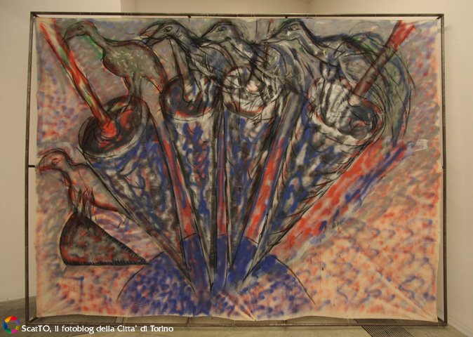 L’incanto di Pageantry of painting. Corteo della pittura, si percepisce da subito. Appena entrati in galleria si ha la sensazione di essere in “casa sua”, perché si respira un’atmosfera che riporta a tutto il suo lavoro, a una produzione che è maturata nel tempo. Le opere in mostra, realizzate tra la metà degli anni Settanta e la fine degli anni Ottanta, provengono sia da importanti musei europei sia da collezioni private e in alcuni casi non esposte al pubblico da molti anni. “La pittura è alla base del suo lavoro – ha spiegato stamattina Fuchs – Mario è sempre stato eccitato dai colori forti come un bambino dalle bambole”. Esposte, sui muri bianchi della Fondazione, una ventina di grandi pitture selezionate dallo storico dell’arte olandese – direttore del Castello di Rivoli dal 1984 al 1990 – con l’assistenza di Cristina Mundici. Si tratta in buona parte di soggetti animali, per lo più fantastici, dalle forme arcaiche, come il rinoceronte o l’elefante, il coccodrillo, la rana e i mufloni, un teatro delle meraviglie.