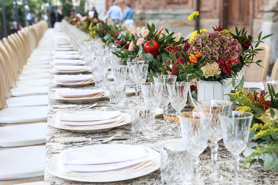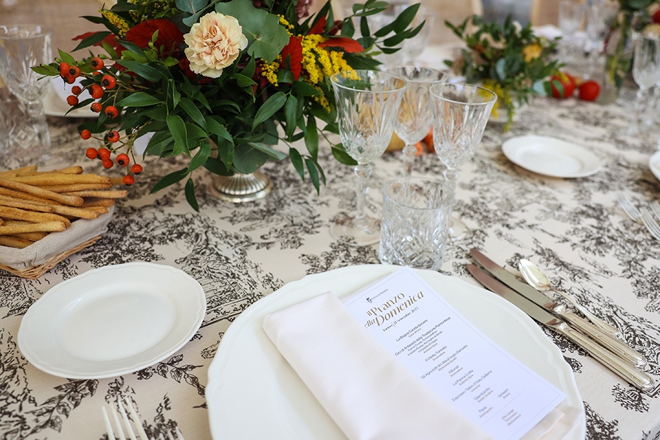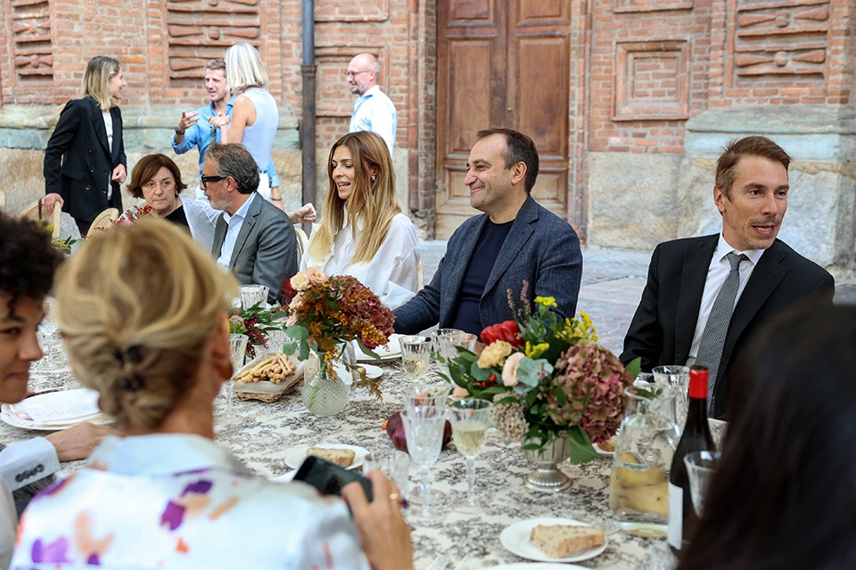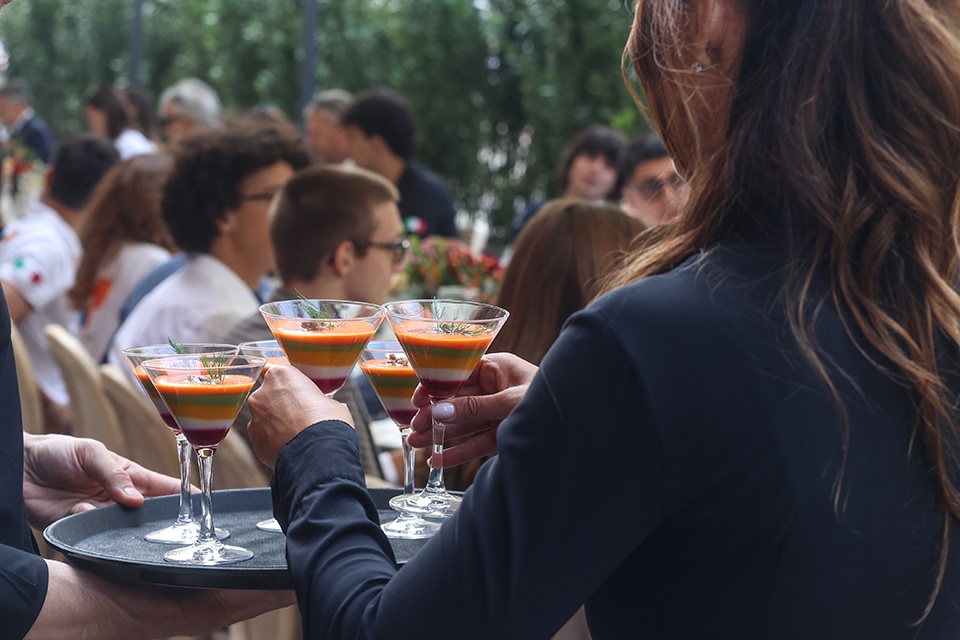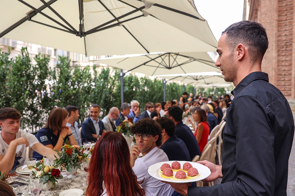In piazza Carignano, il menù è stato curato dal critico e giornalista gastronomico Luca Iaccarino, ideatore di “Buonissima”, e ha portato in tavola pane di Massimiliano Prete e grissini preparati dal panificio Grano, la bagna caoda da bere servita in coppa Martini, iconico piatto del ristorante Casa Vicina, ideato per le Olimpiadi del 2006 e divenuto un must della loro cucina. Poi un giro di antipasti della tradizione piemontese, tra cui le acciughe al verde e l’immancabile vitello tonnato, preparati dai ristoranti Antiche Sere e Scannabue e a seguire gli Agnolotti di Lidia al sugo d’arrosto preparati da Guido Ristorante, mentre per dessert sono arrivati bunet e panna cotta seguiti da caffè e gianduiotti di Guido Gobino.