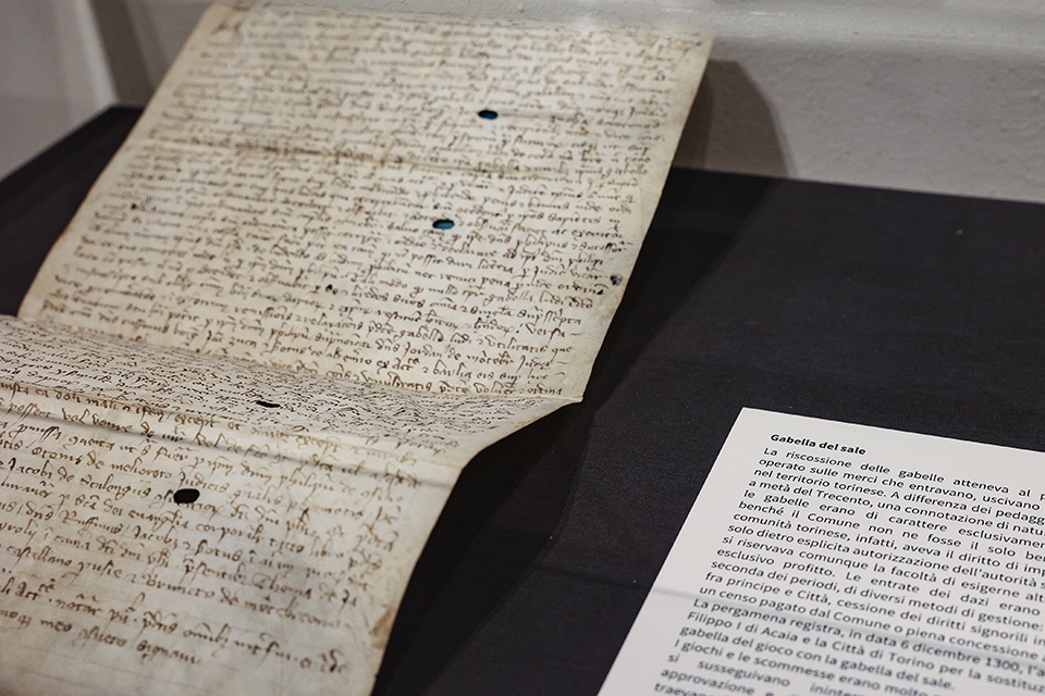 La mostra attinge al vasto fondo documentario civico, che copre quasi ininterrottamente sette secoli di storia, esponendo preziosi documenti medievali che raccontavano la vita amministrativa e quotidiana nella Torino del Basso Medioevo.