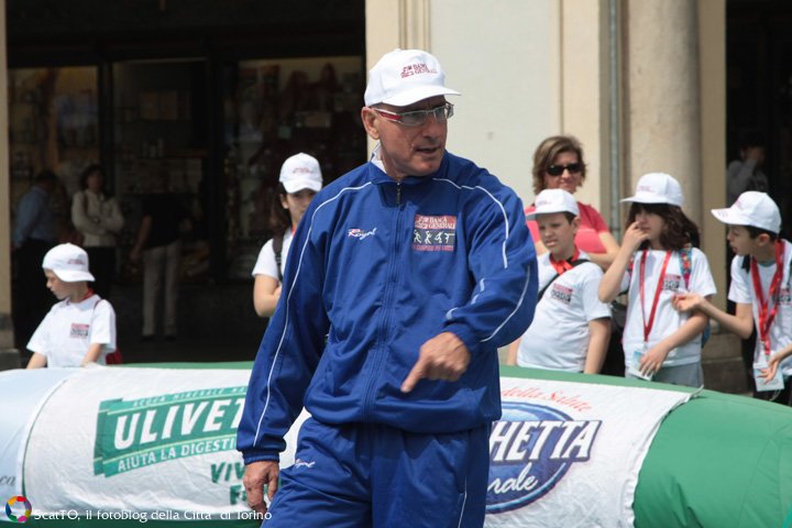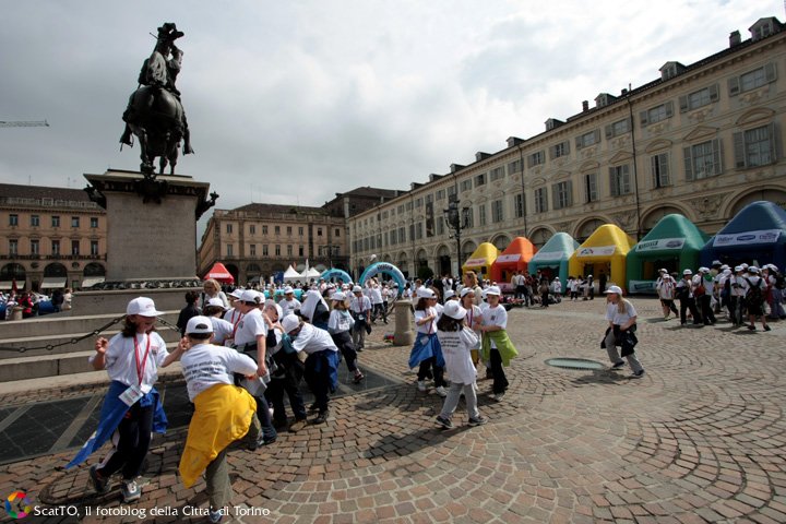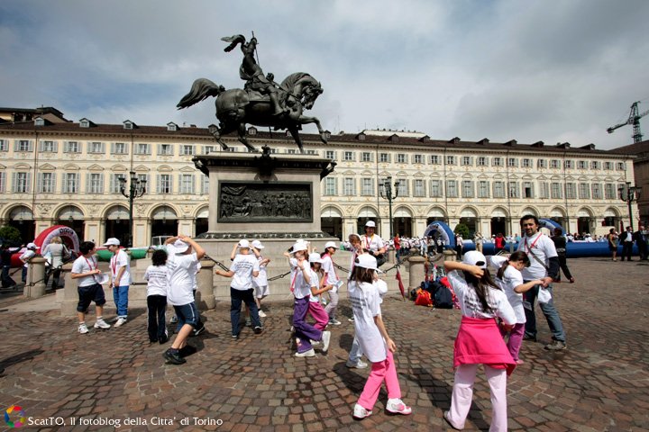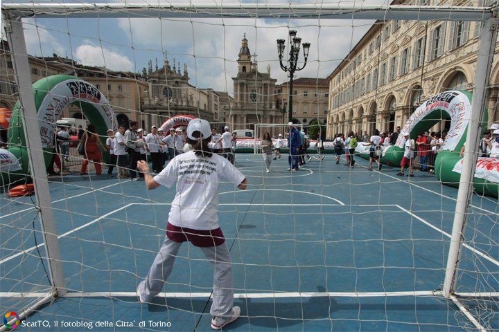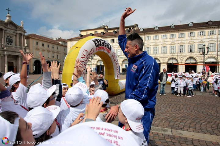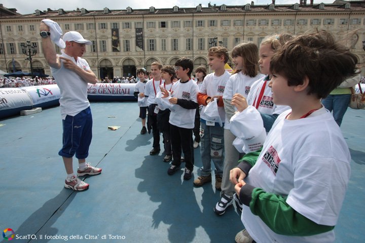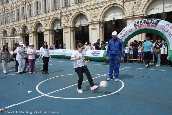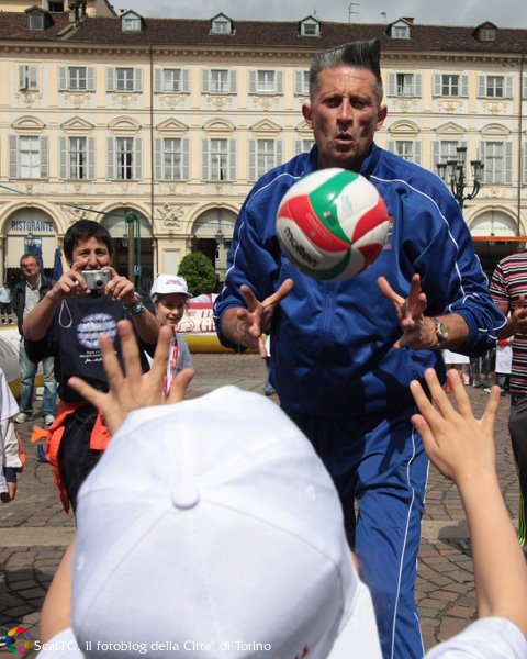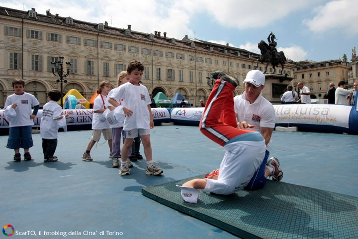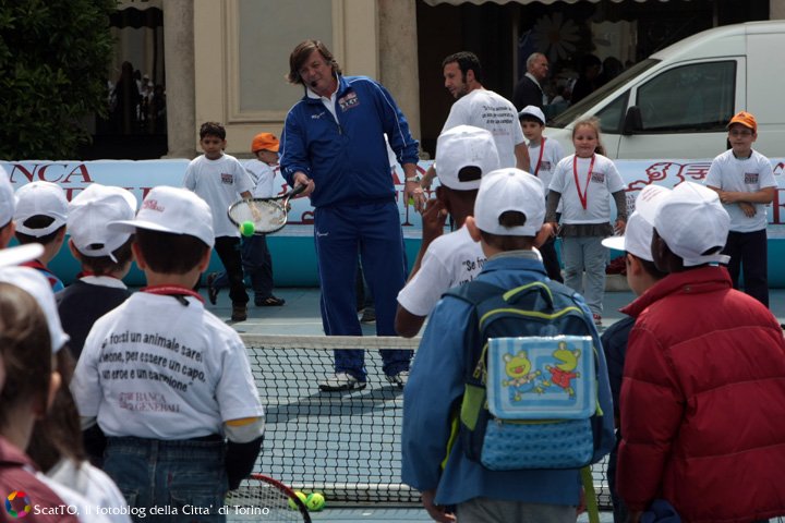 Piazza San Carlo si è trasformata questa mattina in una elegantissima palestra. Lezioni di tennis, calcio, ginnastica e pallavolo con maestri d’eccezione: Adriano Panatta, Ciccio Graziani, Juri Chechi e Andrea Lucchetta..