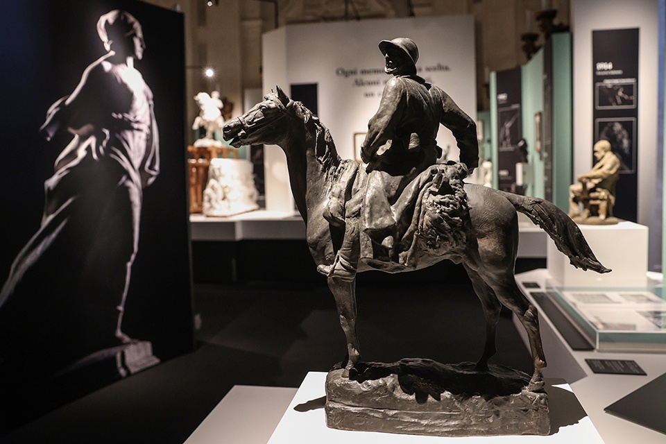 Il percorso riunisce circa cento opere tra modelli in gesso, bronzetti, disegni progettuali, periodici, fotografie e manifesti. Accanto a Marochetti e Pelagio Palagi, emergono protagonisti come Vincenzo Vela, che rinnovò la scultura monumentale in senso verista, e, tra Otto e Novecento, Davide Calandra, Pietro Canonica, Edoardo Rubino, Arturo Martini ed Eugenio Baroni.