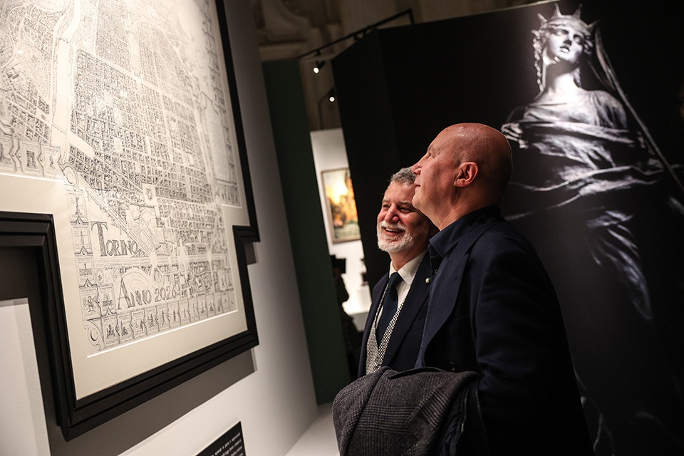 L’esposizione nasce dalla campagna fotografica realizzata da Giorgio Boschetti, che attraverso suggestive immagini notturne restituisce nuova centralità ai monumenti torinesi, trasformando la città in un ideale Teatro della Memoria. A questo lavoro si affianca la grande mappa a china su carta di Alessandro Capra, una veduta ibrida che dal cuore storico di piazza Castello si estende fino al Monviso, collocando e numerando i 79 monumenti pubblici cittadini.