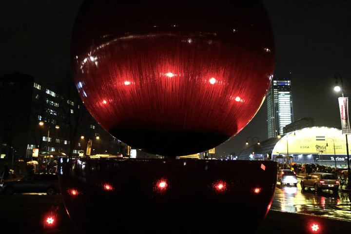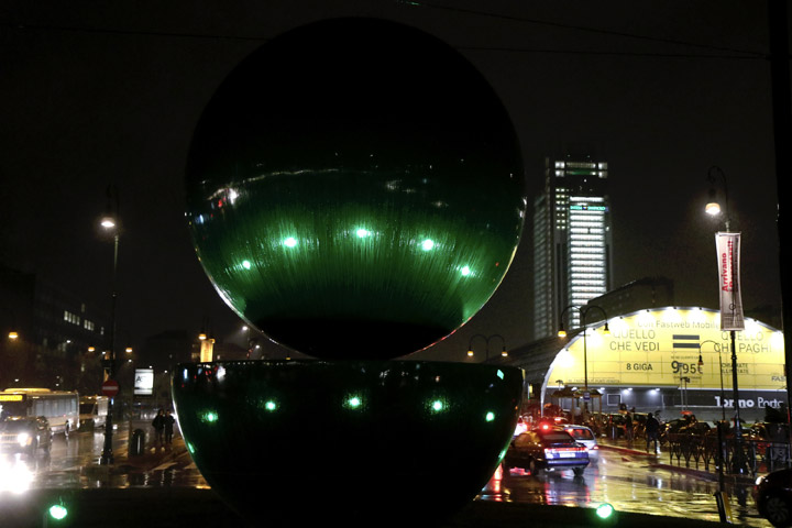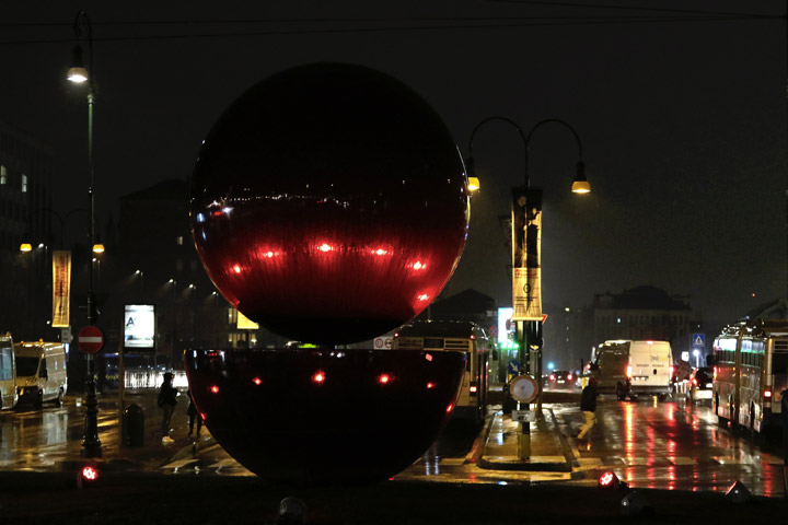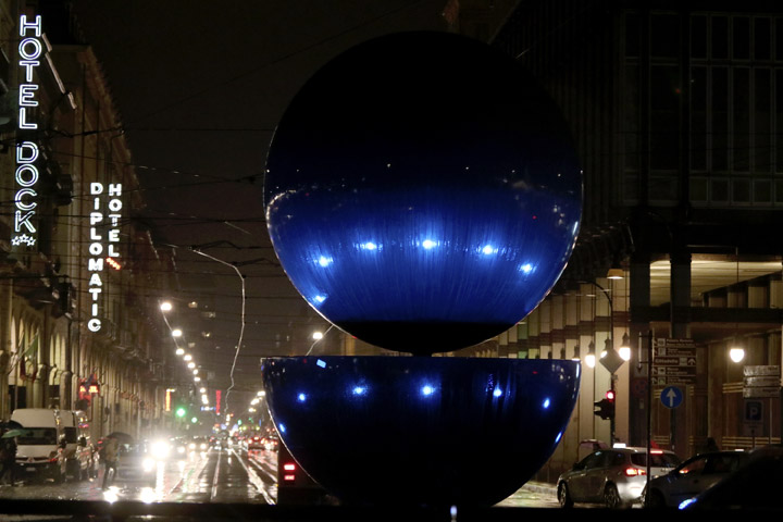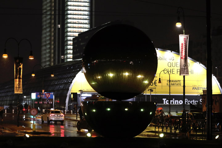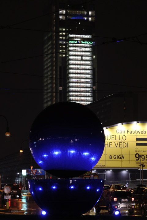 L’opera di Armando Testa, una sfera e una mezza sfera di acciaio nero di circa 5 metri di altezza, sarà illuminata con luci colorate, come a colori è il linguaggio della comunicazione attuale. Saranno luci sempre in movimento, curiose, si faranno vedere da tutti, proprio come insegna da sempre il meccanismo pubblicitario, del quale Armando era profondo conoscitore.
