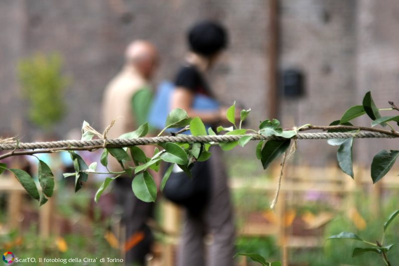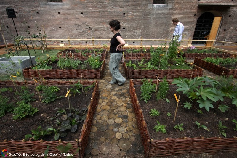 L’orto, di perimetro rettangolare, è collocato lungo il lato est del castello, verso via Po e organizzato per aiuole squadrate entro recinti in salice intrecciato – come attestato nella miniatura medievale -, separate da sentieri in terra battuta con tozzetti in legno e protetto da recinto con disegno a rombi. Attorno ad esso sono stati piantati 12 tra peri e meli.