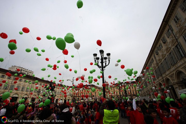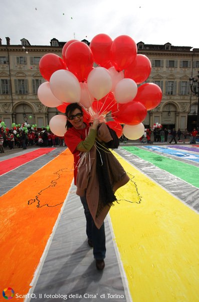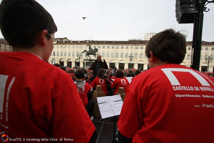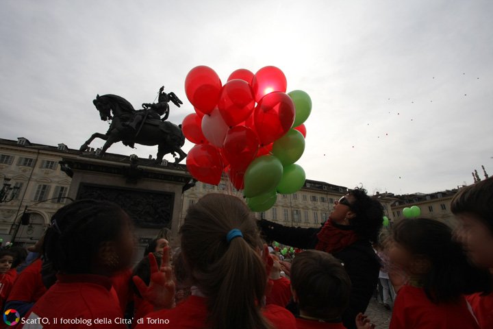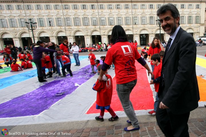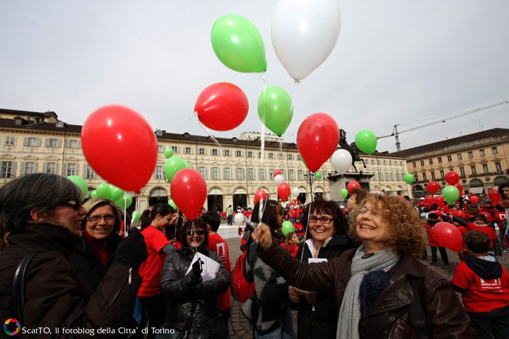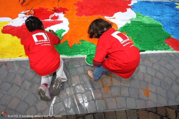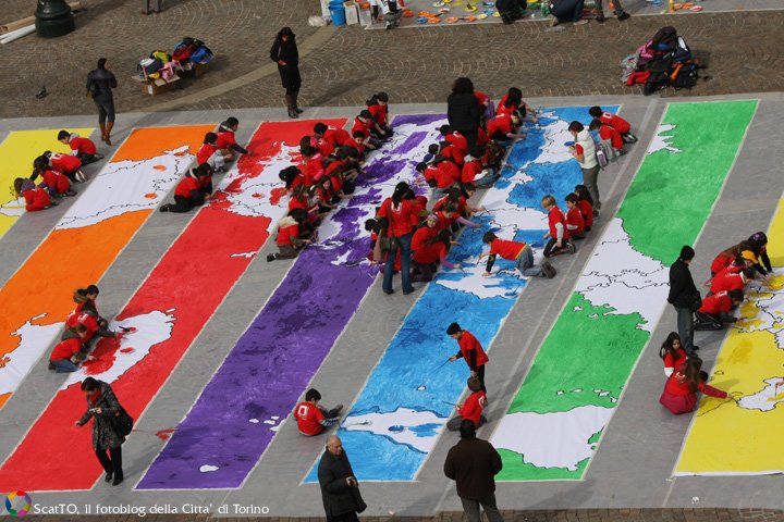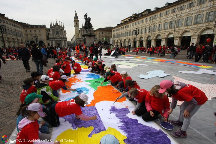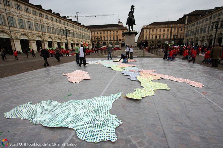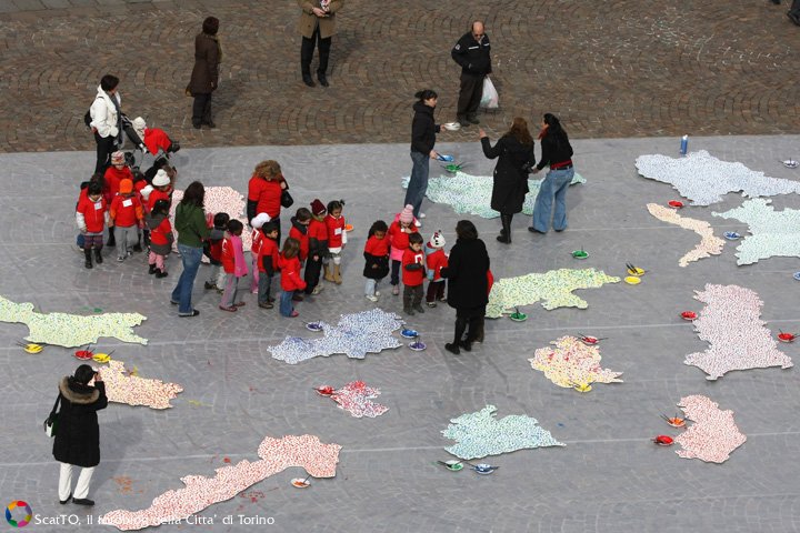 Già dalle prime ore del mattino, oltre 3.500 ragazzi delle scuole del Piemonte si sono riversati in Piazza San Carlo a Torino per partecipare al primo appuntamento di Italiae, progetto realizzato con il Dipartimento Educazione del Castello di Rivoli. I ragazzi, divisi in gruppi, hanno realizzato delle grandi Regioni italiane colorate che, al termine della mattinata, sono state assemblate alle altre per creare la forma del Paese.