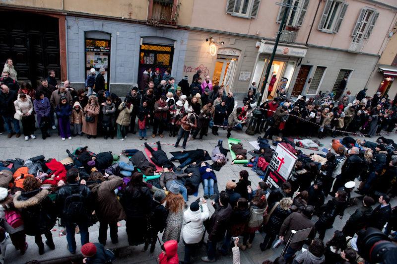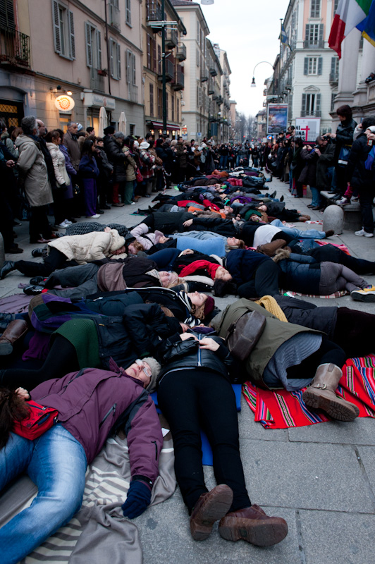 Per ricordare le migliaia di omicidi e sparizioni avvenute negli ultimi 15 anni a Ciudad Juarez, in Messico vicno al confine con gli Stati Uniti, è andata in scena l’installazione artistica di Laura Fusco. In via Montebello, davanti alla Mole, molte donne hanno interpretato una scena corale di forte impatto. Sdraidate a terra, come se fossero prive di vita, sono rimaste immobili per alcuni lunghi minuti. Nel mentre una voce femminile leggeva ad alta voce alcuni nomi delle donne uccise nella città messicana.