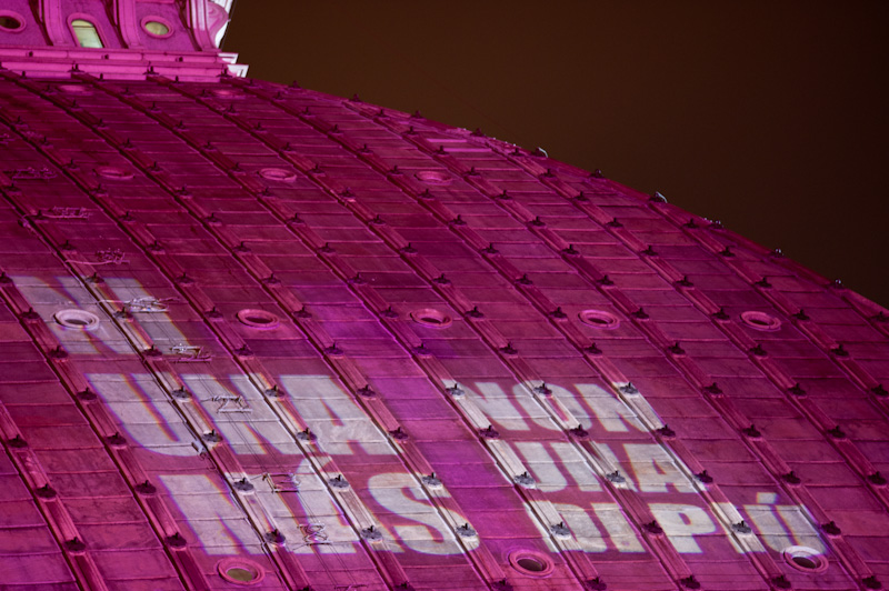 Sulla grande curva mezzana della Mole è stato proiettato con un fascio luminoso bianco lo slogan della campagna in due lingue. Ni una màs affiancata alla traduzione in italiano Non una di più.