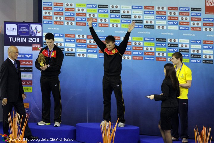 L’ultima gara maschile, la piattaforma individuale, è stata dominata dalla Germania: Sascha Klein esegue una serie di tuffi con coefficienti altissimi, domina tutta la gara e va a vincere con 515,05 punti. Secondo il suo connazionale Patrick Hausding, con un punteggio di 506,10. La coppia tedesca aveva già vinto ieri la gara del sincro dalla piattaforma con 467,16 punti, davanti alla coppia ucraina Bondar/Gorshkovozov e alla coppia russa Minibaev/Zakharov. Terzo si piazza l’ucraino Oleksandr Bondar, già medaglia d’argento nel sincro nel pomeriggio di ieri. Gli italiani Maicol Scuttari e Mattia Placidi, entrambi ventenni, si piazzano rispettivamente undicesimo e dodicesimo. Scuttari mantiene oscilla tra la nona e la decima posizione fino al penultimo tuffo, poi nell’ultimo tuffo, un triplo e mezzo indietro avvitato, apre troppo spesso e totalizza un 39,62 punti, scivolando in penultima posizione con un totale di 393,45 punti, circa 17 punti in meno rispetto alle eliminatorie di stamattina”.