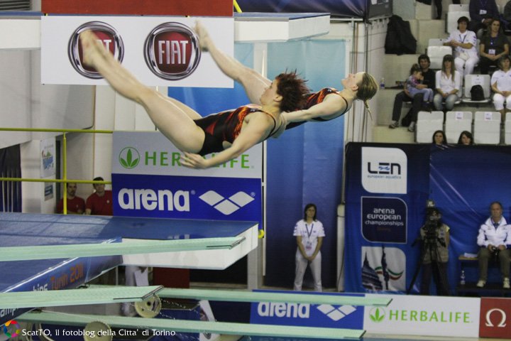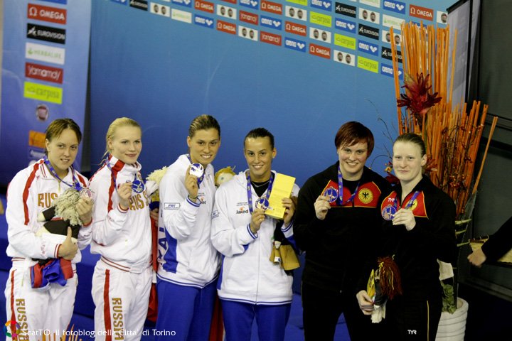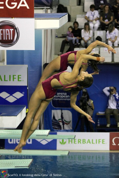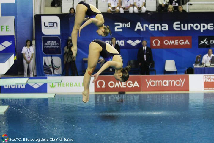 E’ finita con gli oltre mille tifosi in festa alla piscina Monumentale di Torino, che cantavano l’inno nazionale e sventolavano i tricolori in tribuna (calcolate oltre diecimila presenze nelle sei giornate di gara). L’ultima giornata della seconda edizione della rassegna continentale di tuffi si è tinta d’azzurro e del colore più bello: l’oro conquistato da Tania Cagnotto (già oro da un metro e bronzo da tre metri qui a Torino) e la “sorella” Francesca Dallapè dai tre metri sincro, specialità che le vede da tre anni consecutivamente leader incontrastate in Europa e argento mondiale conquistato a Roma 2009, da difendere il prossimo luglio nella rassegna iridata di Shanghai contro le leader cinesi.