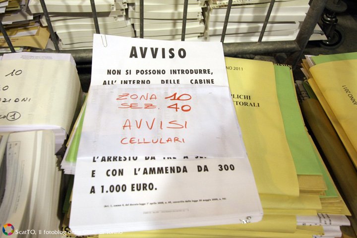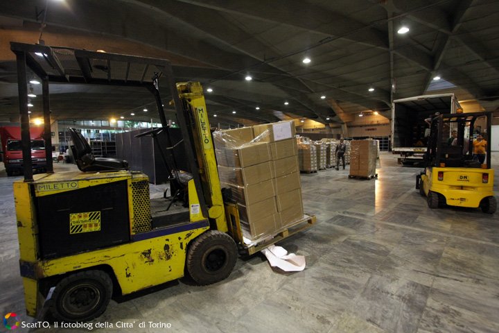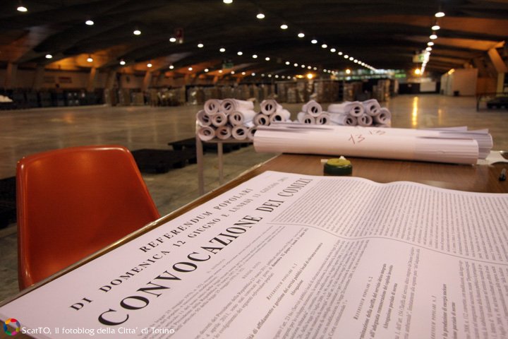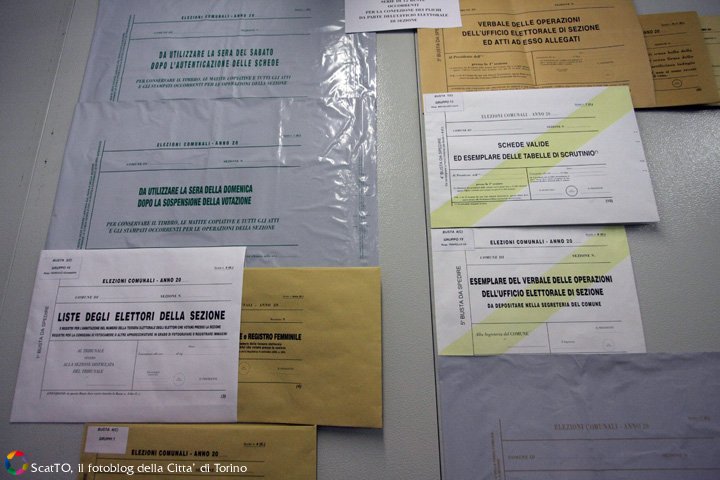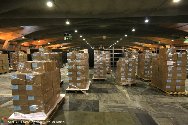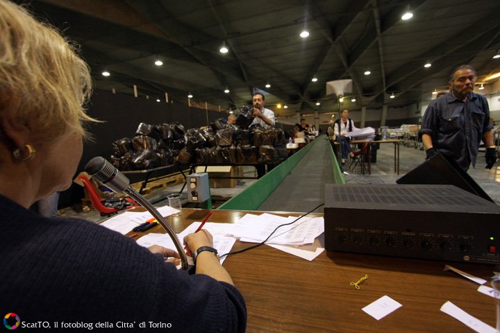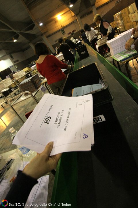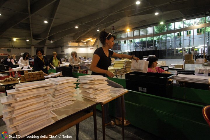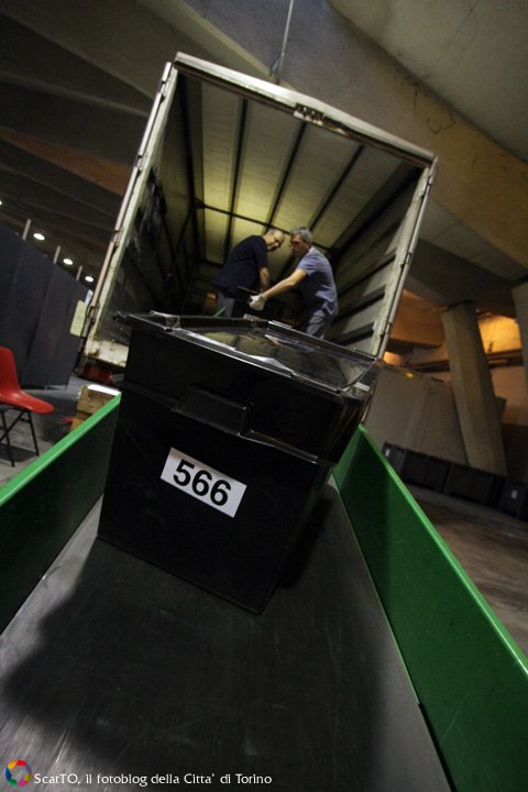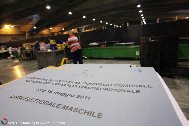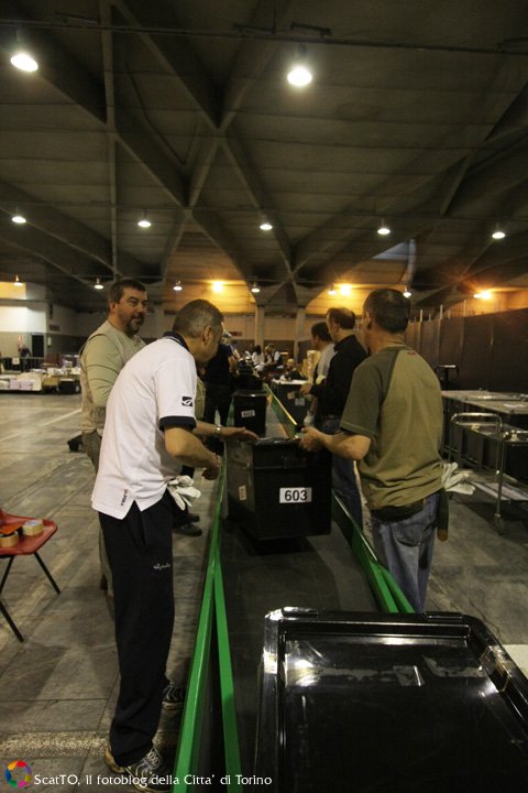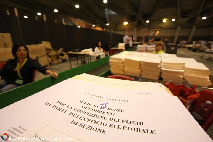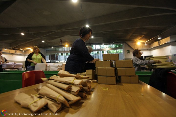 Nel V Padiglione di Torino Esposizione sono in corso le operazioni per la preparazione dei materiali da inviare ai seggi: vengono assemblati e posti in appositi contenitori, uno per sezione. Il Presidente vi troverà registri, buste, avvisi, libretto di istruzione per le operazioni di spoglio.