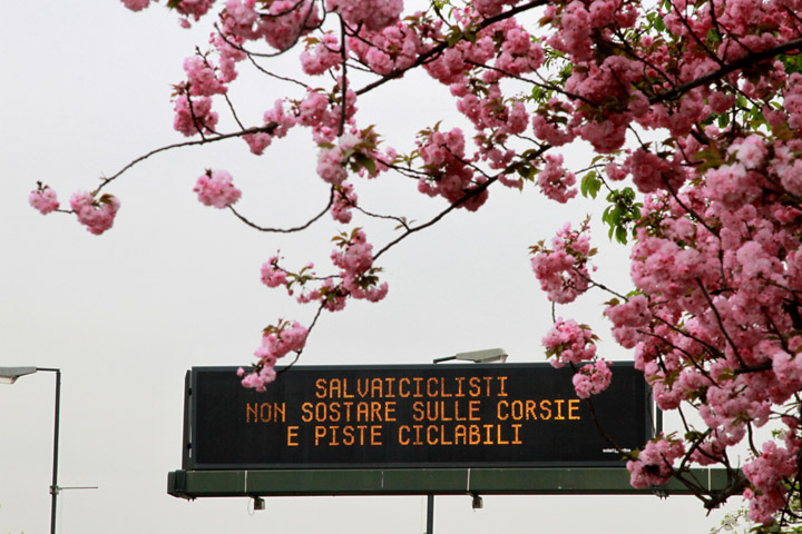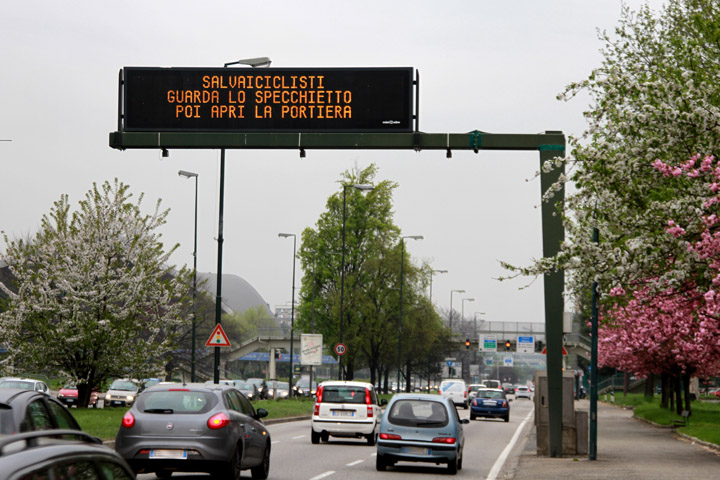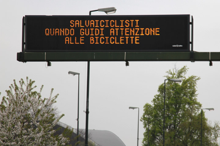 Normalmente i pannelli elettronici sono utilizzati, oltre che per il messaggio standard che riporta data ed ora e la dicitura “Infotraffico 5T”, per segnalare dal lunedì al venerdì dalle 7 alle 19 il divieto di circolazione per i veicoli non ecologici Euro0, Euro 1 ed Euro 2. Con l’inizio della campagna i VMS riporteranno anche quattro testi che, dopo la scritta maiuscola Salvaiciclisti, ricorderanno agli automobilisti “Quando guidi fai attenzione alle biciclette”, “Non sostare sulle corsie e piste ciclabili”, “Guarda lo specchietto poi apri la portiera” e “Quando svolti a destra attenzione ai ciclisti”.
